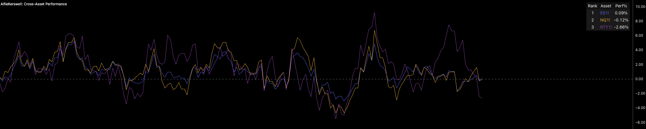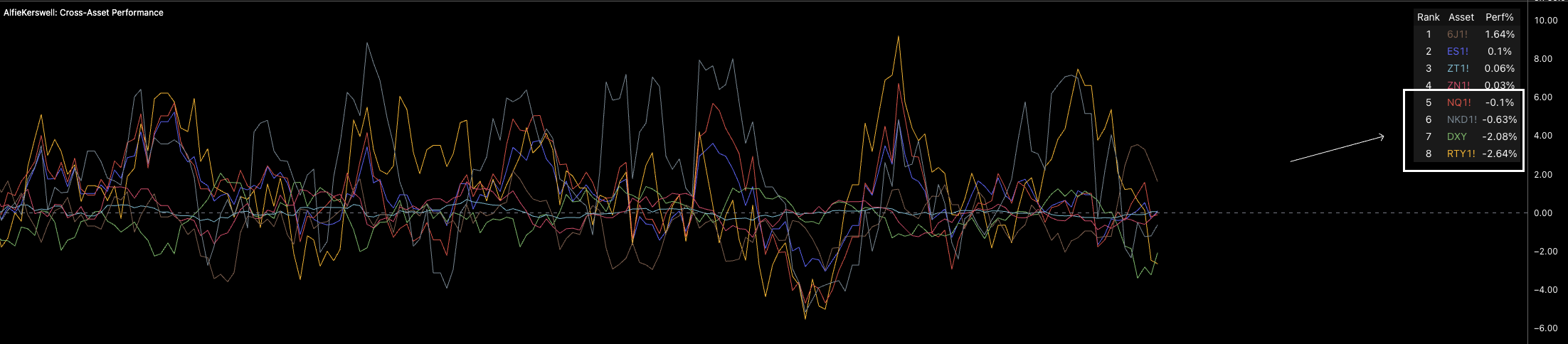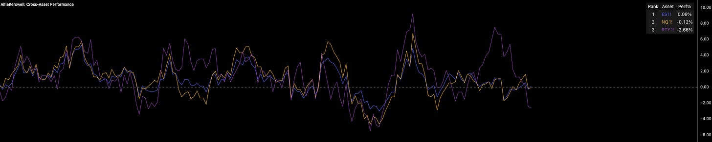 Notice from a cross-asset performance stance that we’re seeing the highest-risk equity indices trade at the bottom of the table. With the Yen, bonds, and ES making their way into the top half, it is clearly a small rotation, but pressures are building, especially after the VIX blew out a little last week.