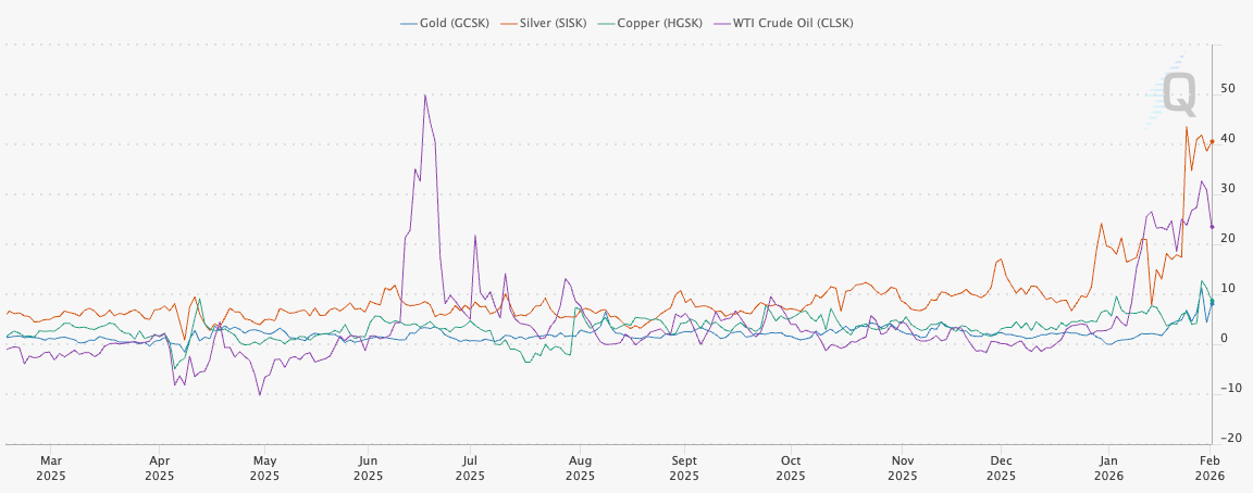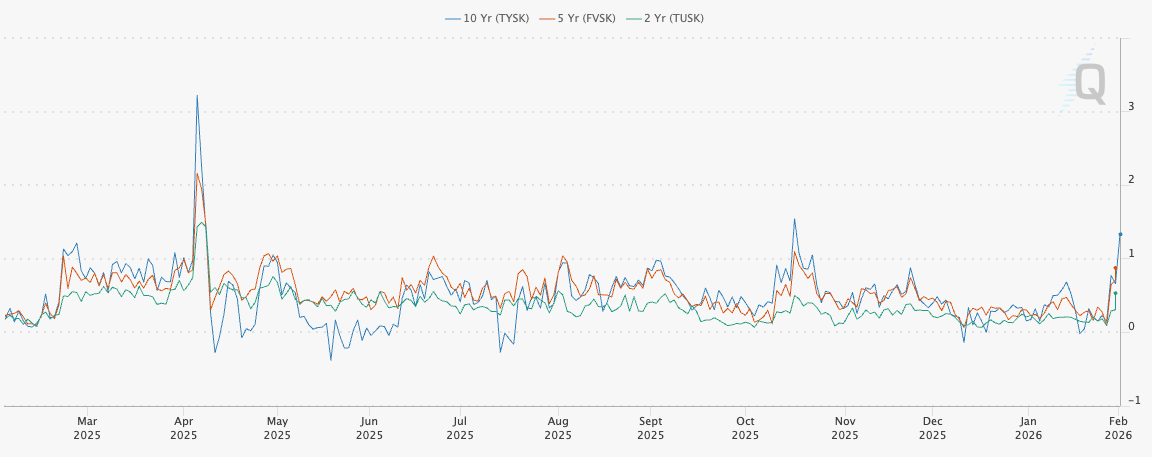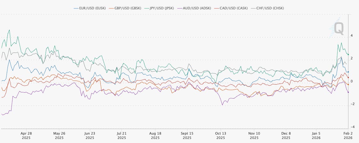 Skew for 2Y, 5Y, and 10Y bonds is also rallying with some pace from lows. Some might say this is directly connected to the newly nominated Warsh (I don’t have an opinion on whether it is, but if I had to, I’d likely say it isn’t); regardless, positioning is still skewing to the upside in bonds. While equities can trade higher alongside bonds, when bond skew is blowing out to the upside, it’s not always pretty for equities.