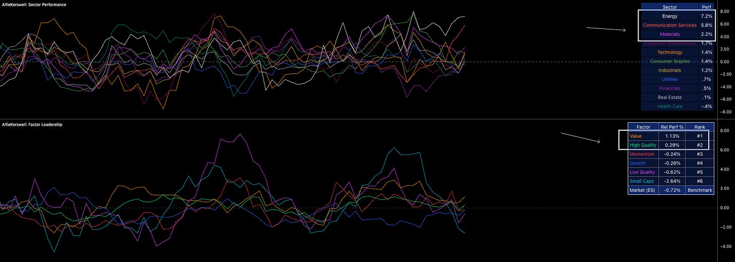 Probably the most telling factor is that sector performance and factor exposure across the last 10 trading days have shown that investors aren't carrying risk in higher risk-on sectors or factors. Value and growth are preferred as consumer discretionary leads alongside energy. While energy has been driven by the blowout in oil, I wouldn't disregard it just because it’s oil-related; in fact, that builds the case further because it shows just how volatile the last two trading weeks have been.