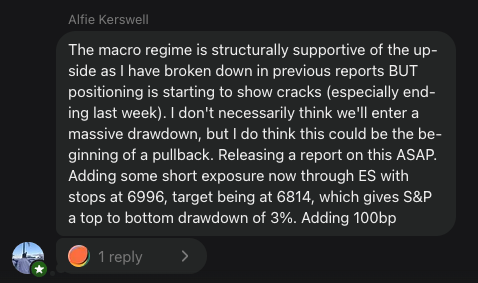I added a note in the Substack chat mentioning that I was going to go short on ES with a relatively close target. I am going to break down in this report why I think we are still structurally supported for upside in equities; however, risks are building. While this could be a mere pullback, I do not think we are entering a bear market at all.