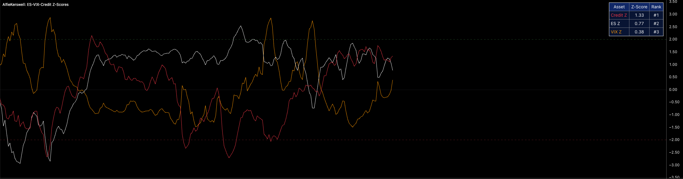 Now VIX is trading positive on a Z-score basis as equity Z-scores rotate to the downside. Clearly, there are more tensions in volatility as equity positioning shifts, causing a negative Z-score for equities. That is not something you want to see when positioning to the upside.