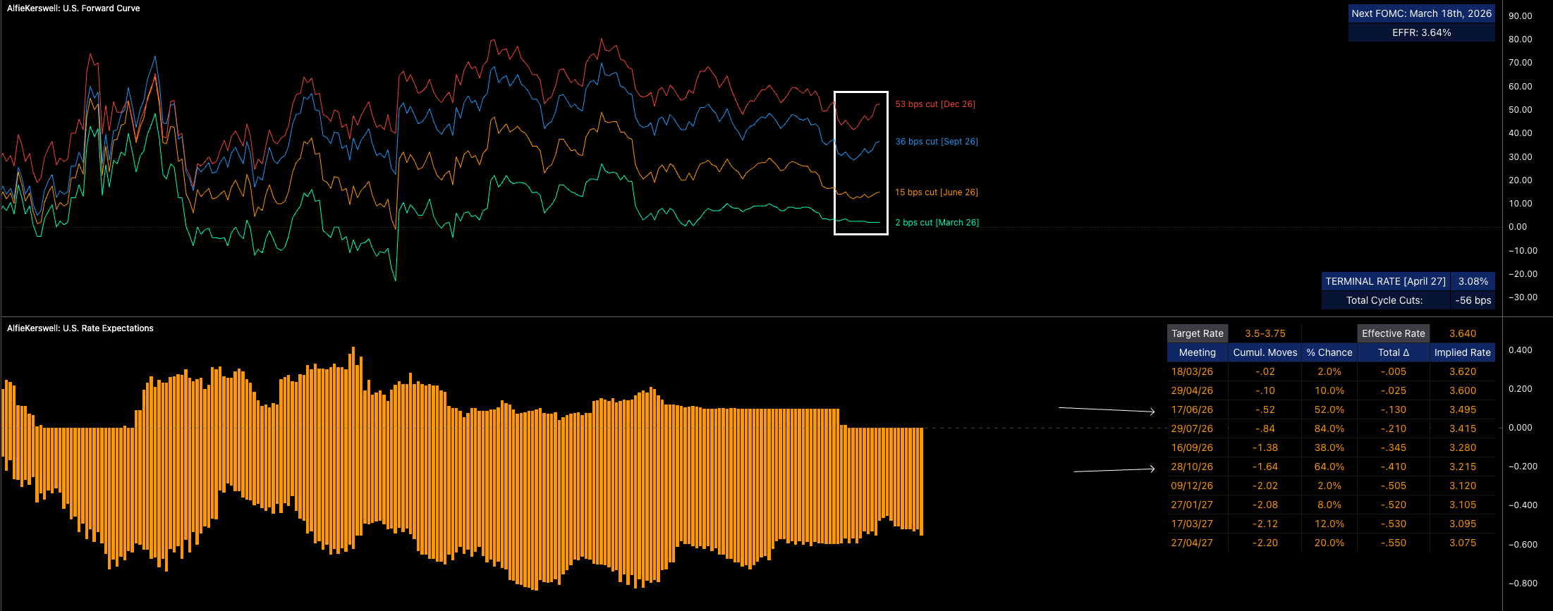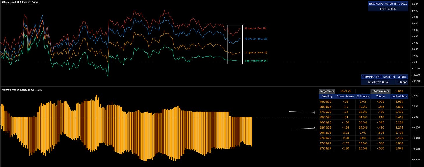 Look at the forward curve below. We actually began pricing in more cuts (marginally, yes, but besides the point, still more cuts) and ES has had no reaction to the upside. I did actually mention in my previous report how the forward curve is causing less upside in equities; likewise, I don't think a hawkish shift would cause major downside because I think we are at an extreme in the forward curve which can’t really get much more hawkish (well, it can, but it wouldn’t make sense).
