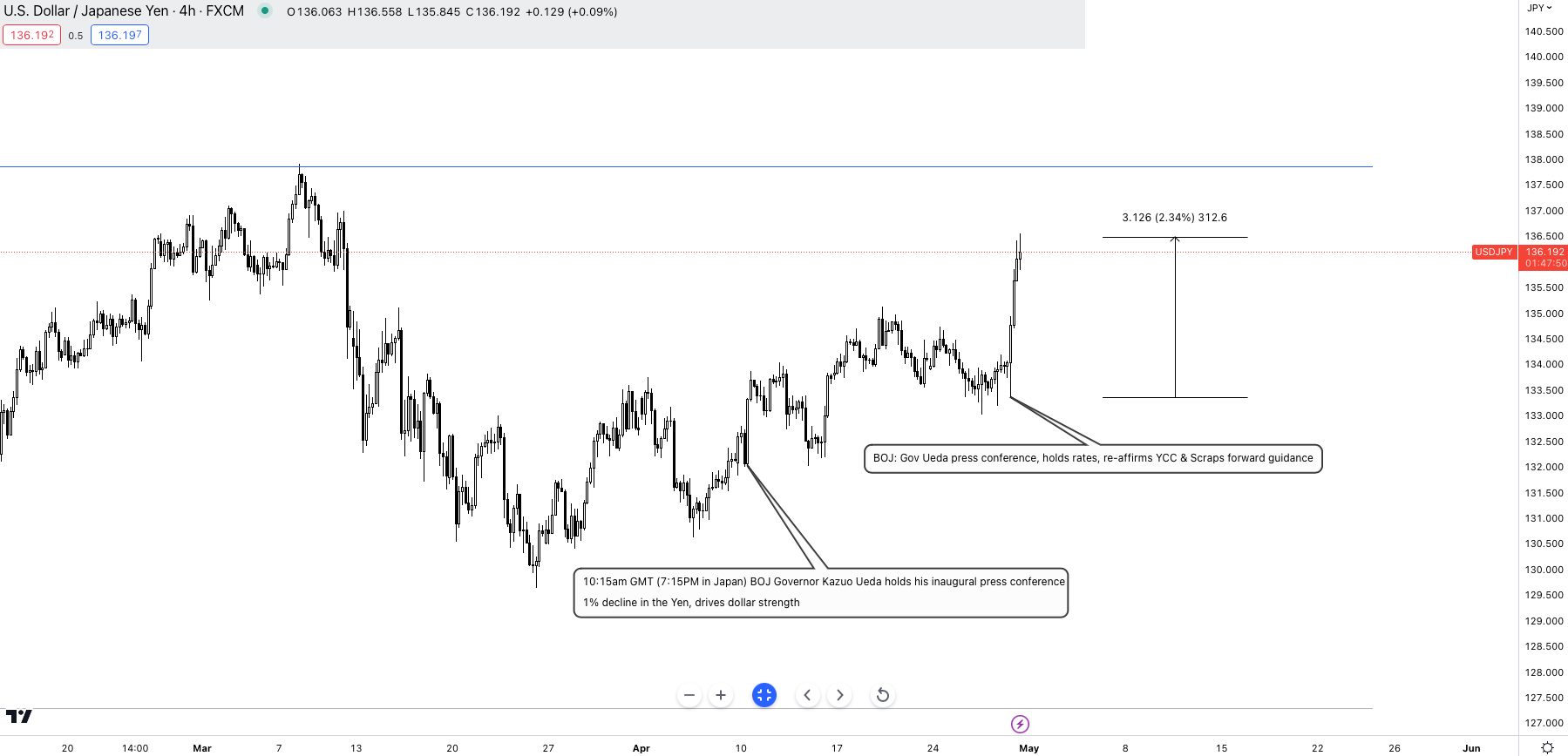 This is the Yen’s movement overnight after the BOJ held rates negative and Ueda removed forward guidance regarding the BOJ’s policy. From previous reports you will all know interest rate spreads/differentials are key drivers behind currencies. ‘Hot money’ flows to destinations with the most attractive money market yields, and the Yen is bottom of that list making it an economy where investment flows outside of the four walls rather than inwards.