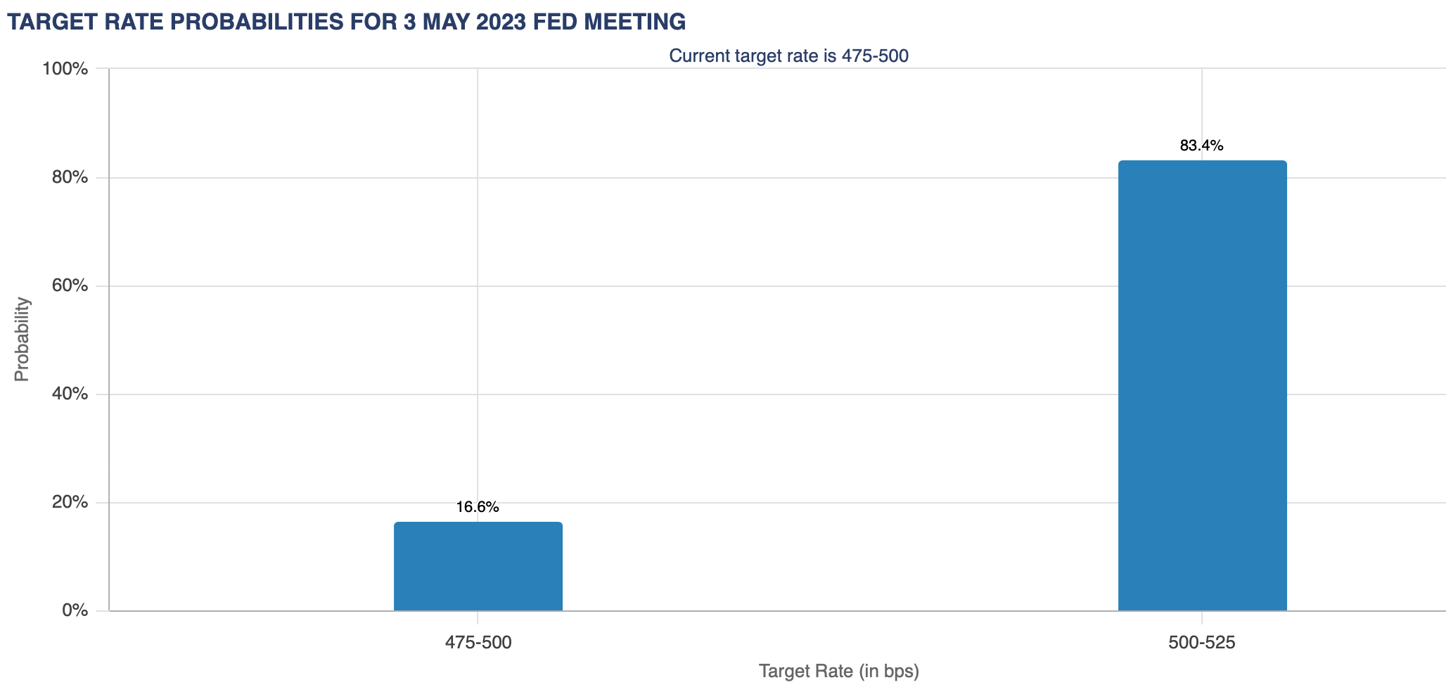 The Fed meet in 5 days, May 3rd. It’s clear to say the market is set on 25bps, I personally expect to see some softness in the dollar post the Fed hike as this has been priced in since early/mid-March post the SVB collapse and banking frenzy.