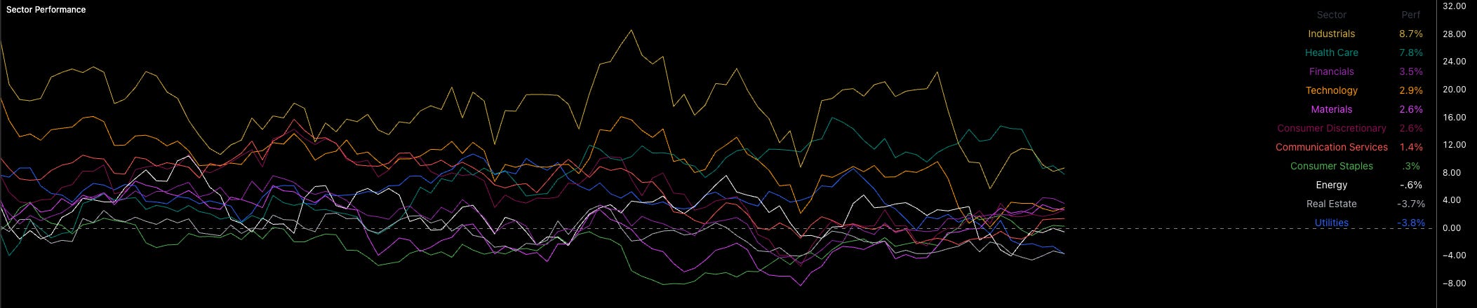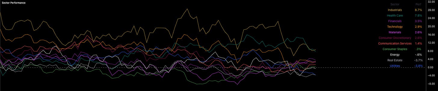 Sector performance over the last 60 trading days has actually been much more supportive of risk-taking. Even with healthcare sitting 2nd, the overall mix is strong. Industrials are leading, with financials and tech close behind. Risk is still being recycled into equities. That said, we’re not seeing this show up in crypto, which clearly has issues of its own.