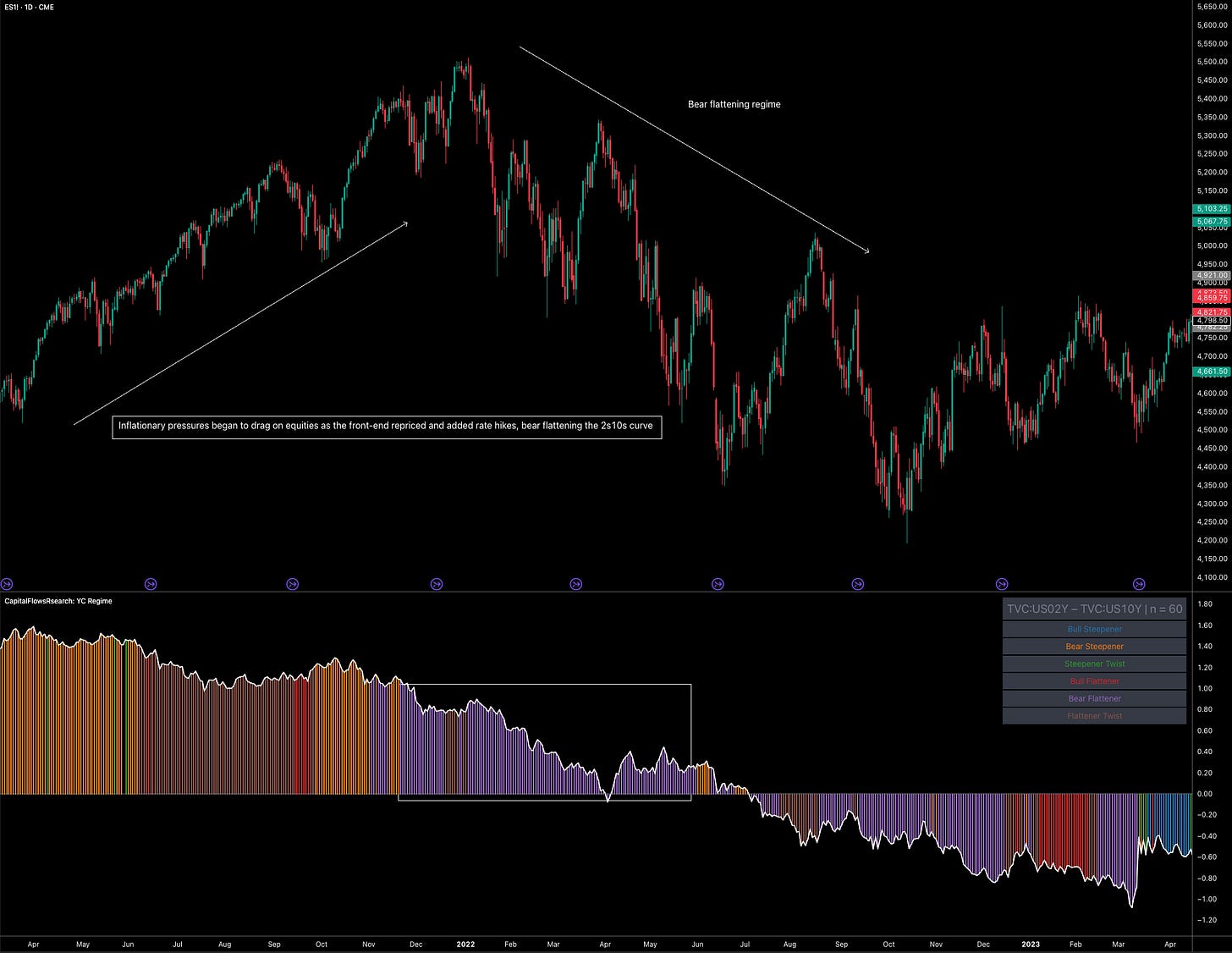 A sustained bear flattening, particularly one driven by inflation pressure and a repricing of the front end, can easily mark an equity top. 2022 is the reminder everyone forgets. But as I laid out above, I believe that any bear flattening would be temporary.