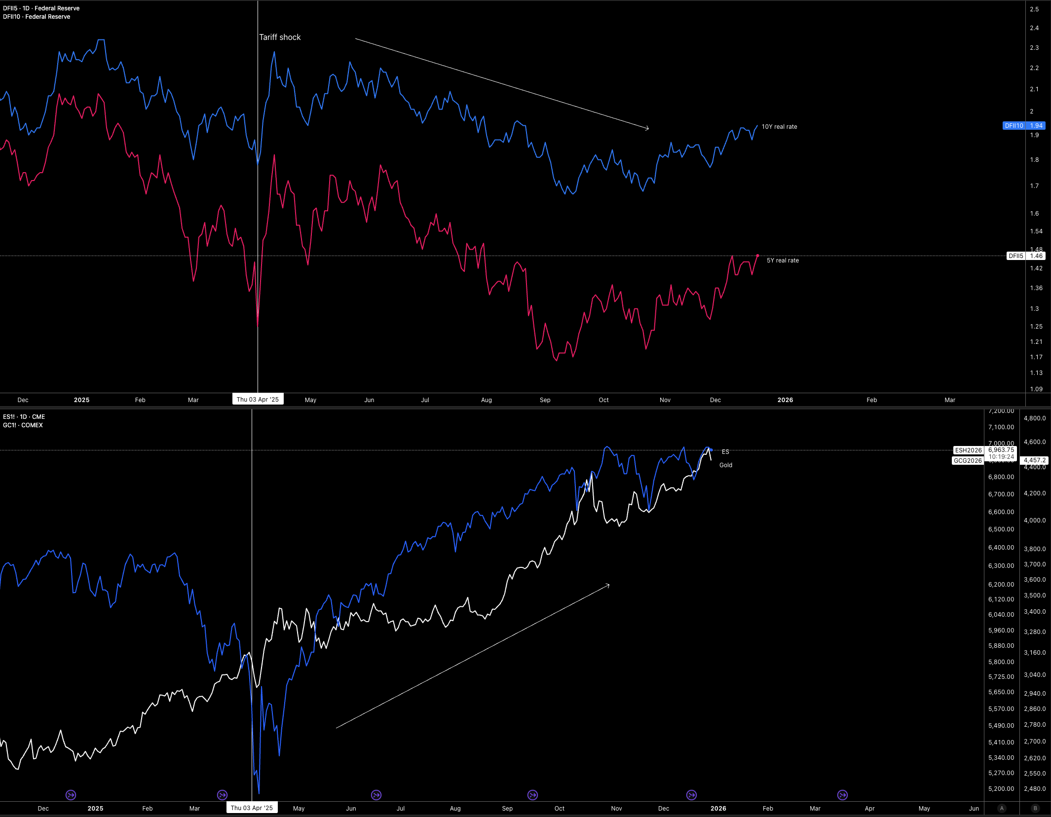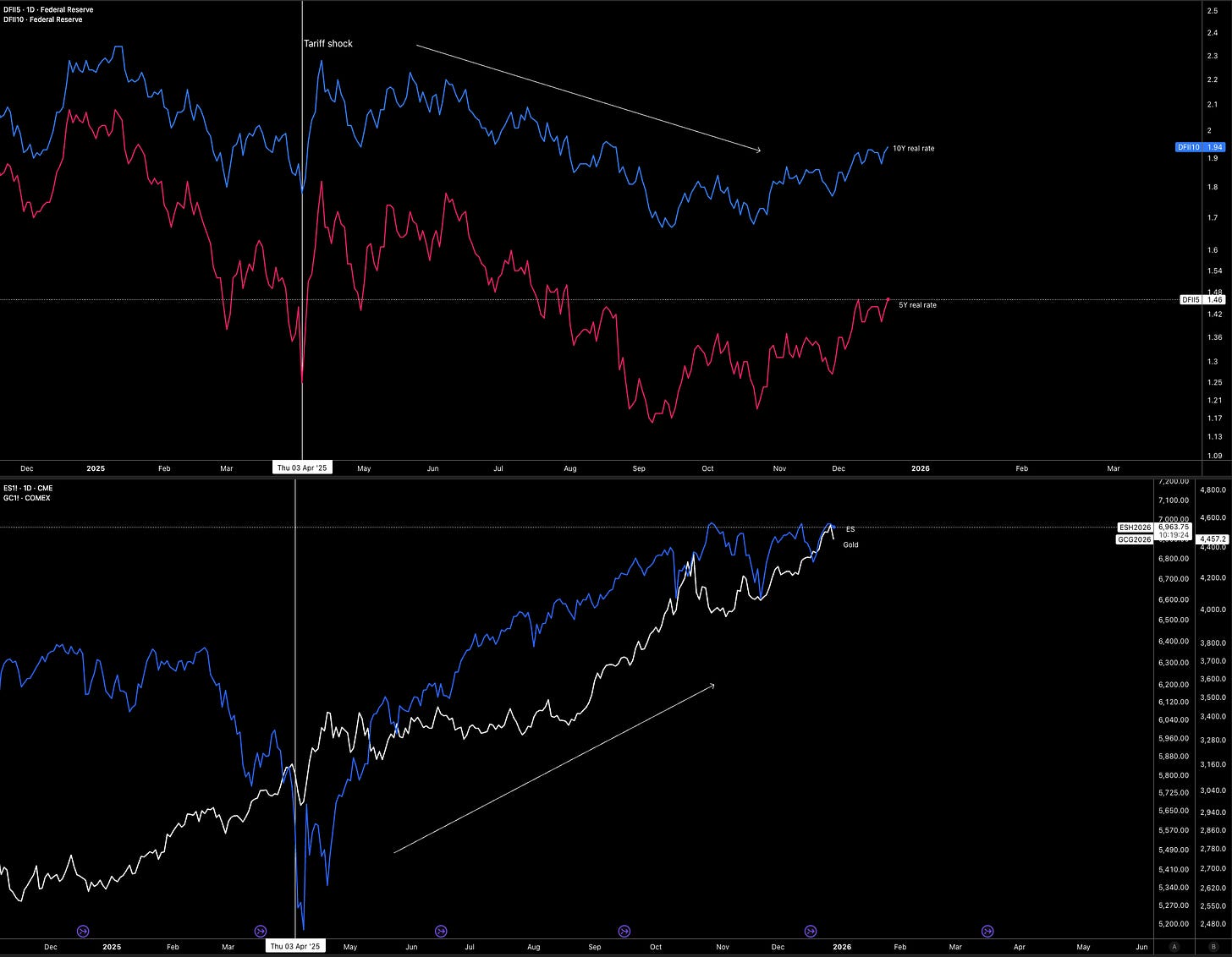 If 2025 had a single dominant macro driver, it was real rates. Almost every meaningful shift in liquidity flowed through them. When real rates pushed higher, ES struggled and even gold came under pressure. When real rates fell, liquidity spilled into equities, gold, tech, and anything with beta. That relationship has been strikingly consistent.