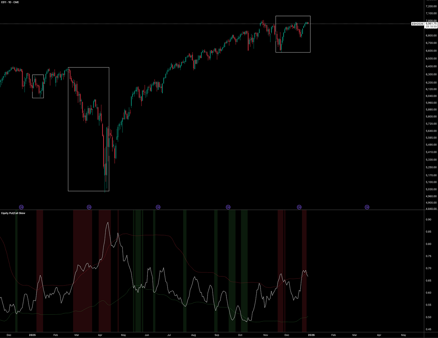 Another, smaller source of concern for ES positioning sits in the equity put/call skew. We saw several months of upside chasing in the skew as equities rallied, tensions eased, and liquidity searched for risk wherever it could find it. More recently, equities have moved into a range, with downside covering becoming more visible in the skew. This isn’t an environment where I’d want to be running leveraged long exposure. Similar to factor exposure, I’d want to see a shift in the skew here before I position.