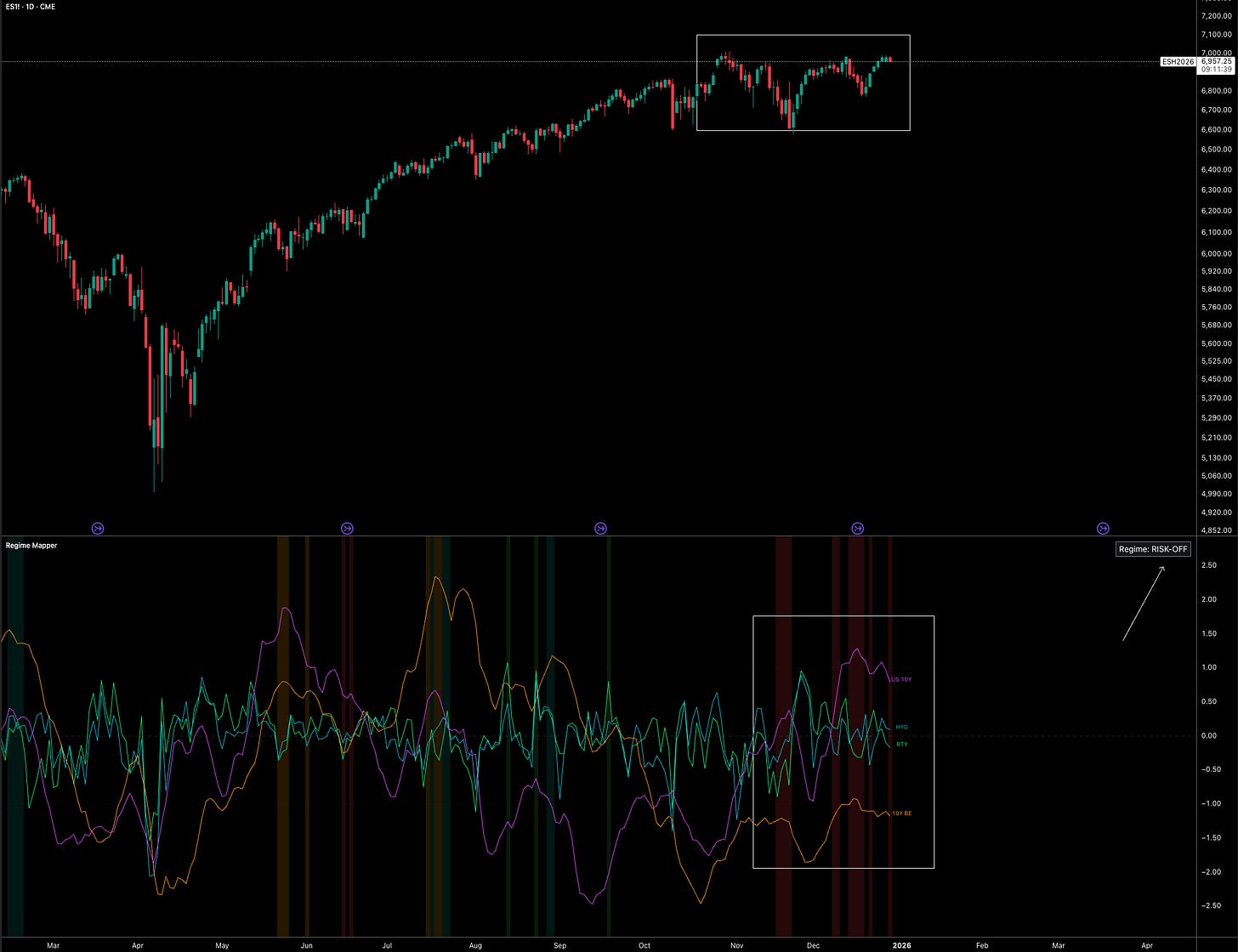 The key point is this: even when you have a strong structural bias on the regime, you still need positioning to line up before the odds favour being leveraged long. One of my performance models that monitors the 10y, RTY, breakevens and credit spreads below is currently signalling a risk-off regime. We don’t rely on a single confirmation, but for positioning this matters. Just look at how well the model behaved as equities rallied through 2025.