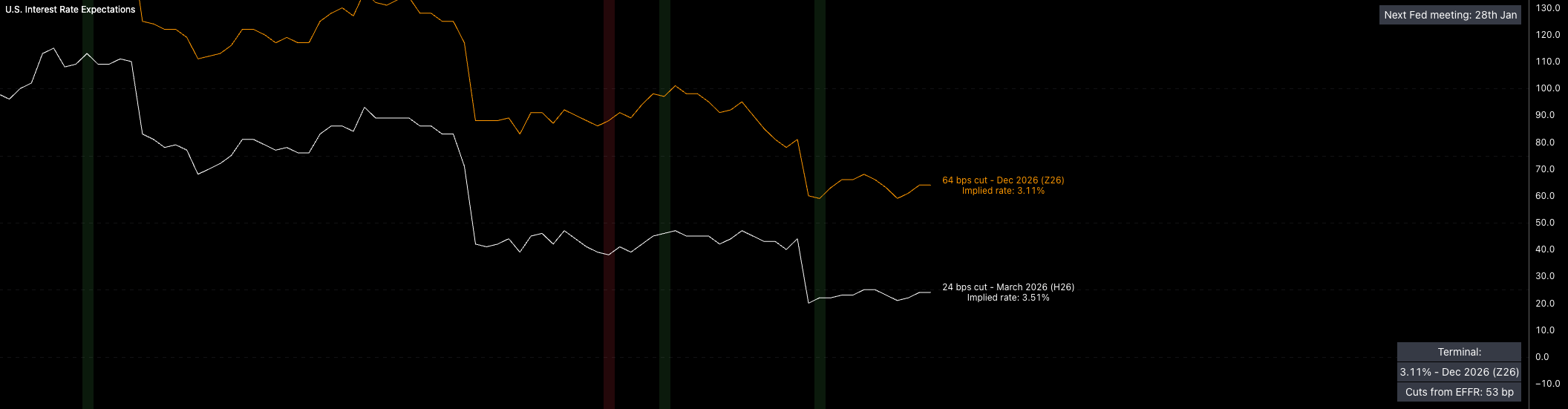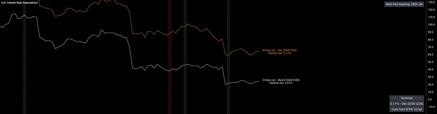My base case for real rates in 2026 is a trend lower, driven by inflation that stays sticky (from exceptional growth) while the Fed remains unreactive to higher inflation (I’m basing this on how they reacted through 2025 when inflation swaps and inflation metrics ticked higher while more cuts were being priced). The market already looks close to peak accommodation, with roughly 3 cuts priced, and I see that as the upper bound for 2026. In reality, I expect closer to 2 to actually be delivered if the inflation tail-risks are realised. Easing momentum has been pulled into the first half of the year rather than the second. If cuts begin to move back out to further contracts (September or December), then liquidity can contract fast (if real rates are directly impacted) and this will be something key to watch.