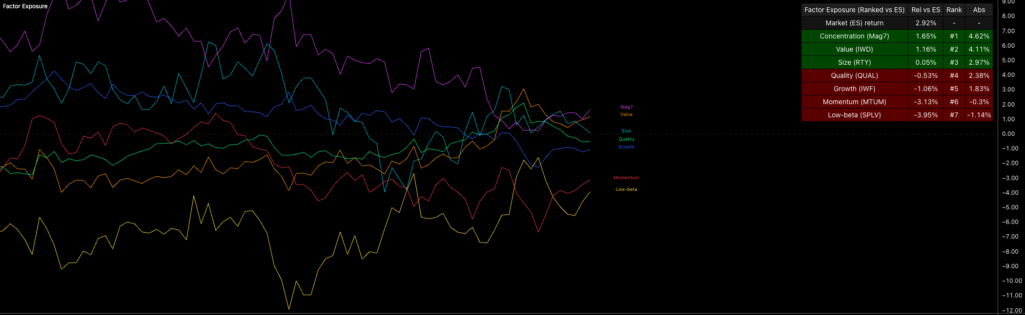 The factor exposure basket isn’t telling me ES is about to rally 5% in January, and it isn’t calling the end of equities either. What it is showing, over the past 3 months, is a clear shift in appetite. Growth and momentum have been slipping down the rankings, while concentration and value have moved into the lead. That isn’t a high-risk-on setup. For me to have high conviction that equities push meaningfully higher from January, I’d need to see that factor leadership rotate again.