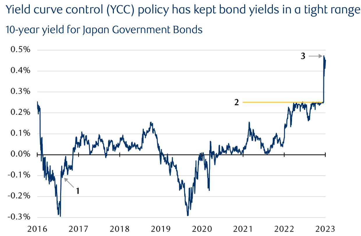 As one can see from the above, YCC does a great job at keeping yields within the range, which at first in 2016 was +/- 25bps from zero, but as you can see by no.2, this became increasingly difficult due to the inflation rate globally which also affected Japan forcing the eventual move seen as point no.3 in December 2022 where the BOJ increased their YCC band to 50bps above or below 0%.