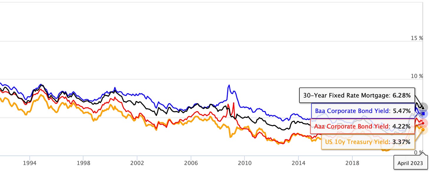 It’s very clear the direct relationship between bond prices and bond yields, if the BOJ were to stop buying treasuries and invest domestically we would see a massive rally in yields as the price of the risk-free instrument dumps. You can see from Figure 1 how closely interest rates follow the direction of the 10y, whether that be corporate bonds, or your 30-year mortgage for your family in the U.S, your bank, or mortgage lender would use the U10Y as a benchmark and add on a risk premium in the form of additional interest rates onto your loan making the loan profitable for the institution before lending out. That risk premium is the reason 30y fixed mortgages and corporate bonds pay more interest.