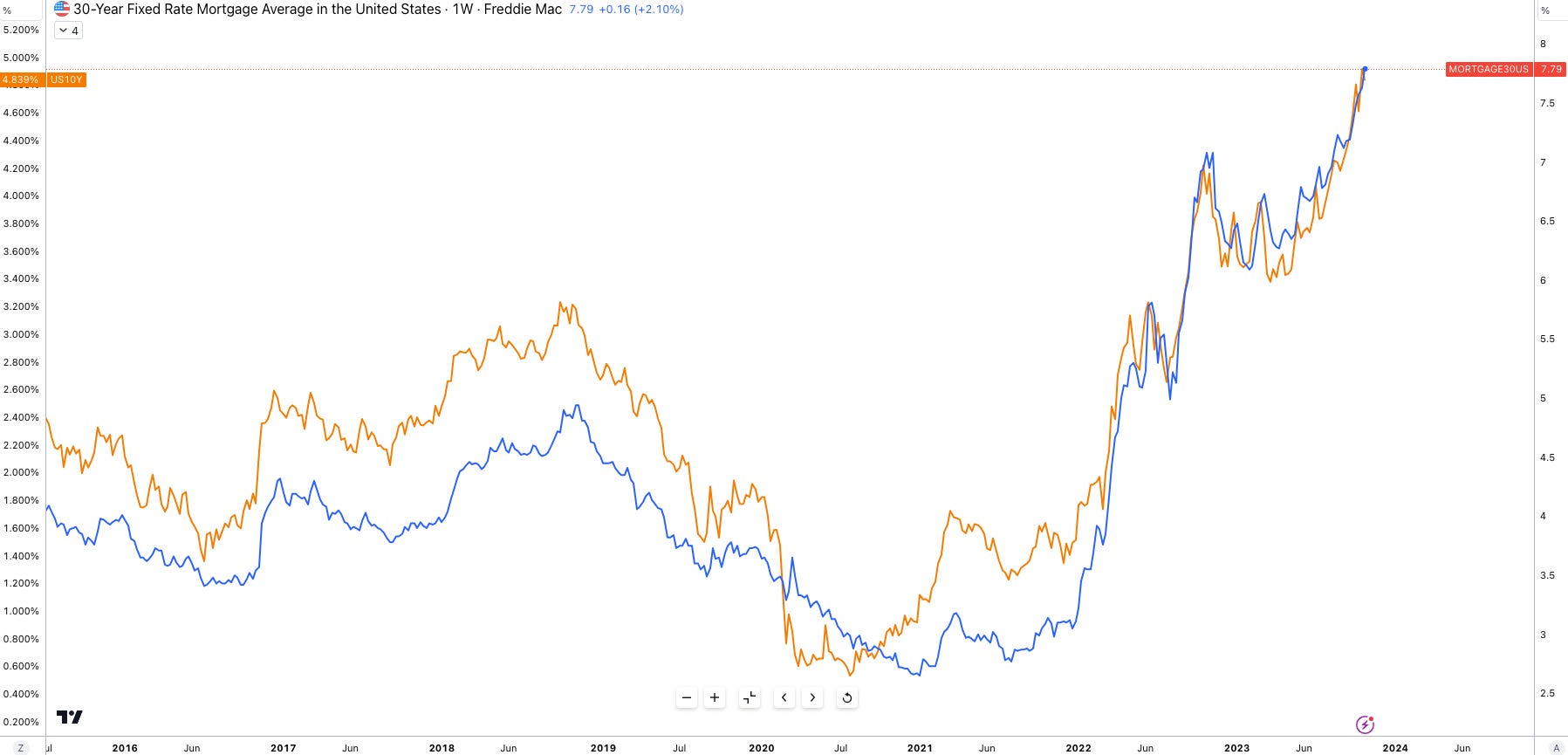 This is an excerpt from the Future Investment Initiative conference in Saudi Arabia last week, where Larry Summers was asked about his view of a soft or hard landing for the U.S. economy in 2024. To see what’s going on a bit deeper here’s the US10Y against the 30-year fixed rate mortgage average in the U.S compiled by Freddie Mac, a government agency.