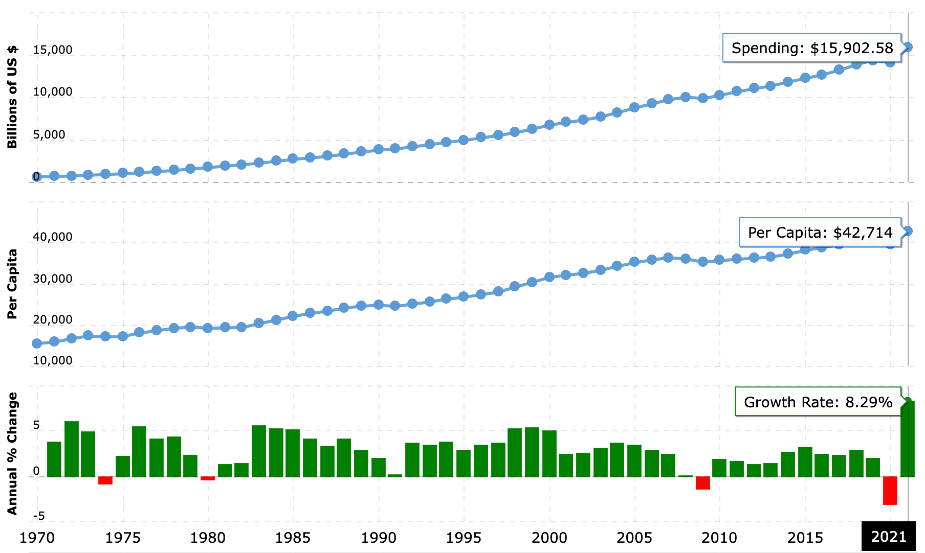 Here’s why this is a relative surprise. October marks the month when 45 million people with student loans resume their monthly payments, which average out monthly to be $200. That means roughly $9 billion will be removed from consumer spending every month, or annually, $108 billion a year. Everything is based on relativity, so to gauge the impact on the U.S economy we have to first understand how much the U.S consumer spends annually.