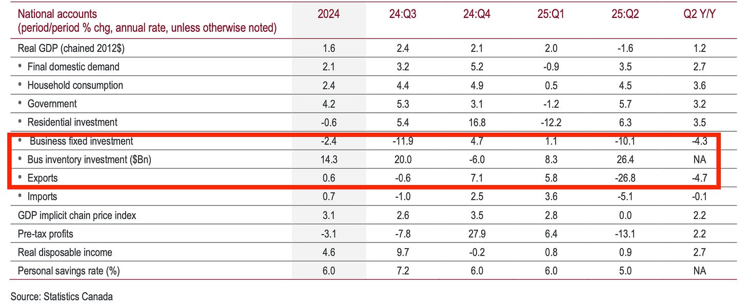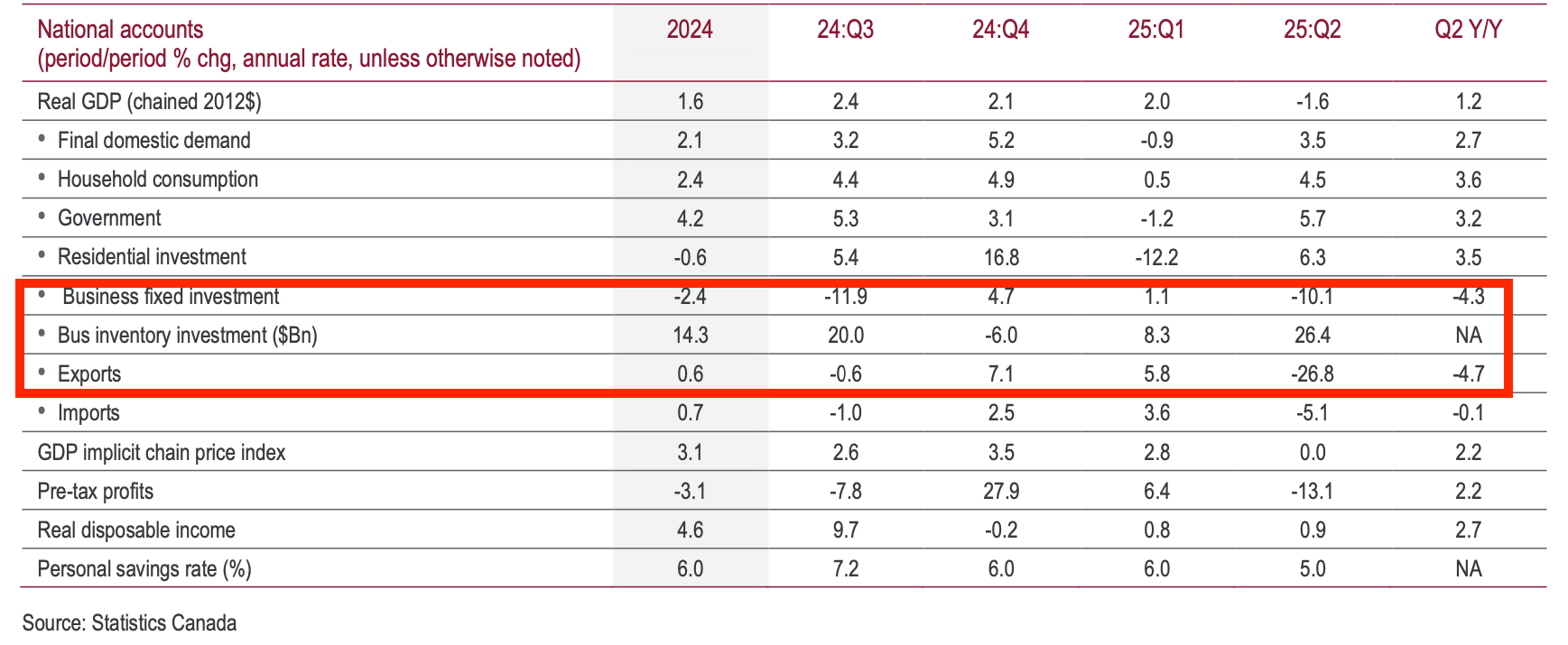 Few standouts to the recent GDP figures is the drag from business fixed investment, likewise the unwinding of Q1 tariffs front-running. As devious as these figures are, in comparison to the July BoC MPR, it’s almost in line with forecast as GDP only disappointed 10bps by the bank estimate. At face value, this offers somewhat of a mixed read. Household consumption and final domestic demand beat, however not because consumers are flushed; rather we are now seeing the upward effect of tariffs on prices add particularly in autos with household saving falling to 4% (1pp reduction from previous) leaving us to believe that room for growth is questionable here on out.
