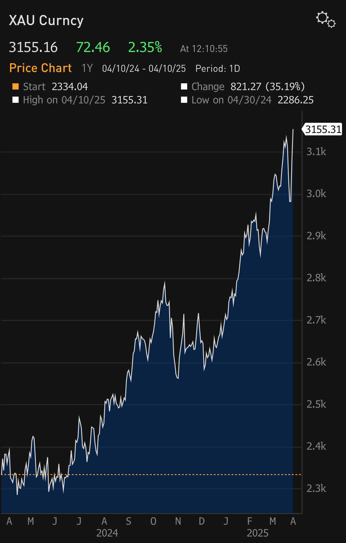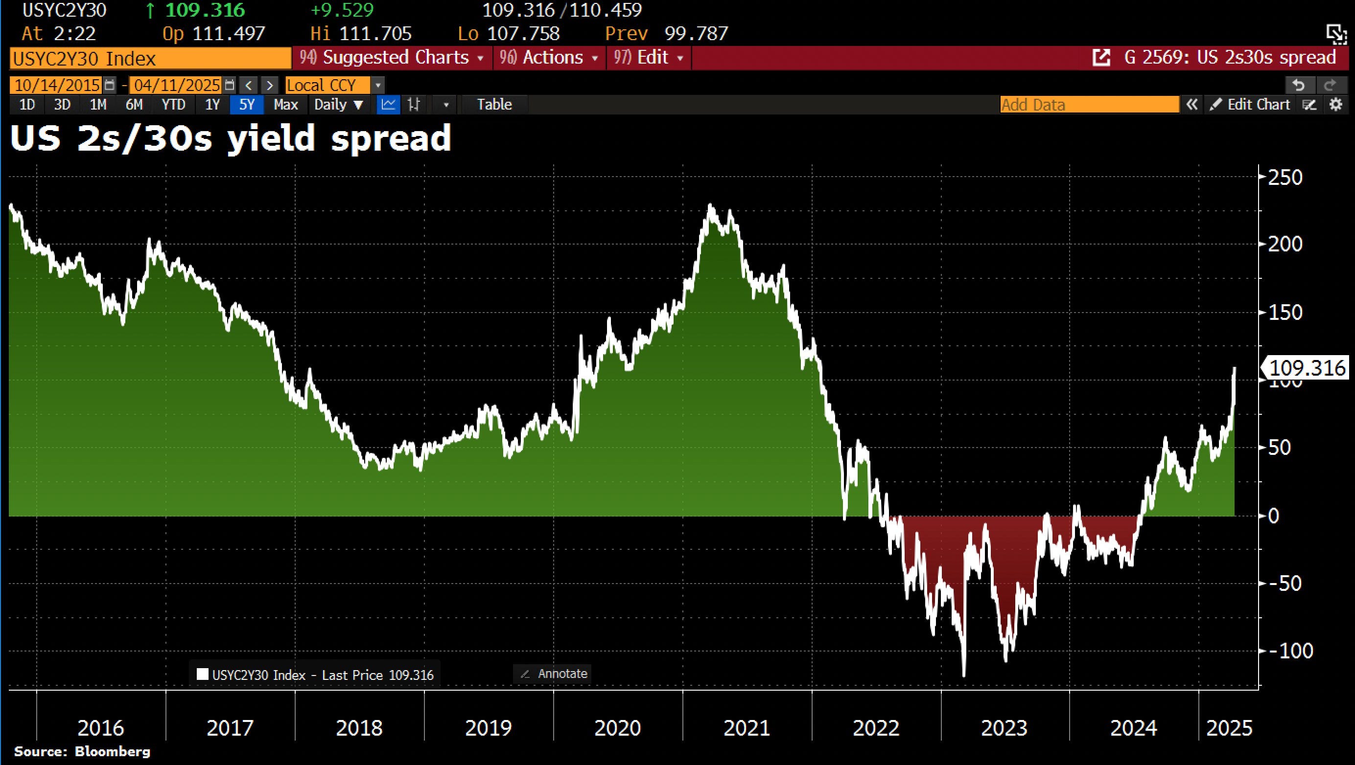 The stock market has seen a sharp selloff, with the VIX soaring to 50 — a level rarely reached. At the same time, U.S. Treasury yields have jumped, with the 10Y climbing more than 50bp in just five sessions (crazy, I know). Meanwhile, the U.S. dollar is plunging, down c.4.5% against the Euro since early April. This unusual mix of moves suggests we’re entering a very different and volatile market regime. According to Goldman Sachs, hedge funds executed their largest ever net sales of equities after the Trump tariff release, retail are the last to sell.