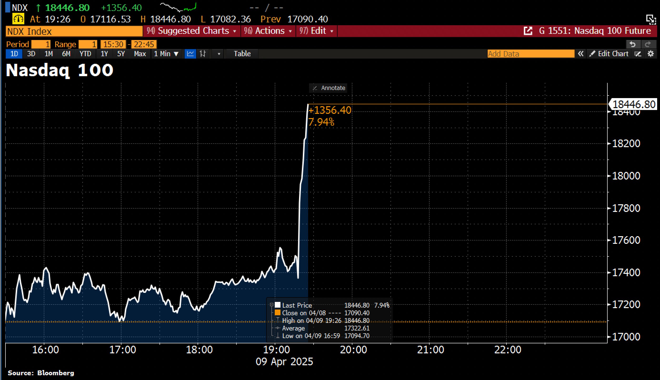 A very good play in the markets this week was fading the temporary “Trump pump” across equities/indices. I managed to fade the S&P500 and FTSE100 moves for c.2.8% profit and to me, this was a high probability play. Temporary sentiment drove that move higher but it made no sense at all, tariffs are still at the highest levels seen in nearly 100 years with many tariffs still over 20%. Even in a scenario where tariffs are completely deleted in 4 weeks (almost a 0% probability, but I’m giving an example), there will be some transmitting that they’ll do even for the small amount of time they’ve been in place, negative for equities. This was the c.7.94% pump that the Nasaq 100 see just after Trump’s 90-day pause on reciprocal tariffs: