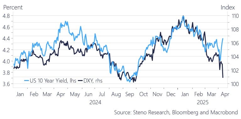 Typically, when market sentiment turns notably negative, U.S. yields decline, and the US dollar strengthens. However, this time the reverse is true.