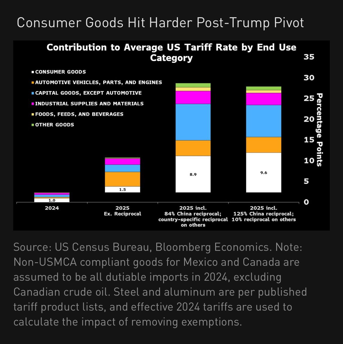 China exports more consumer goods to U.S. than other countries, so boosting that (to 145% ETF) relative to others will boost the hit to consumption goods. See Figure 6 below for that breakdown: