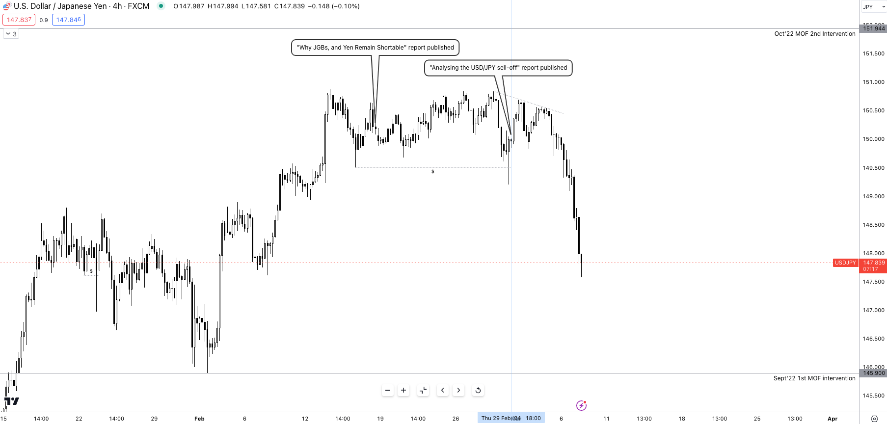 As of the time of writing, USD/JPY is trading at 147.850, down 2.3% since the first published report.