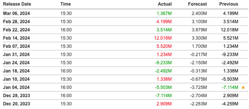 U.S crude oil inventories have generally surpassed forecasts, except for January 24th, 2024, which saw a draw of 9.223 million barrels. February 14th marked the largest positive surprise, exceeding expectations by 8.7 million barrels.