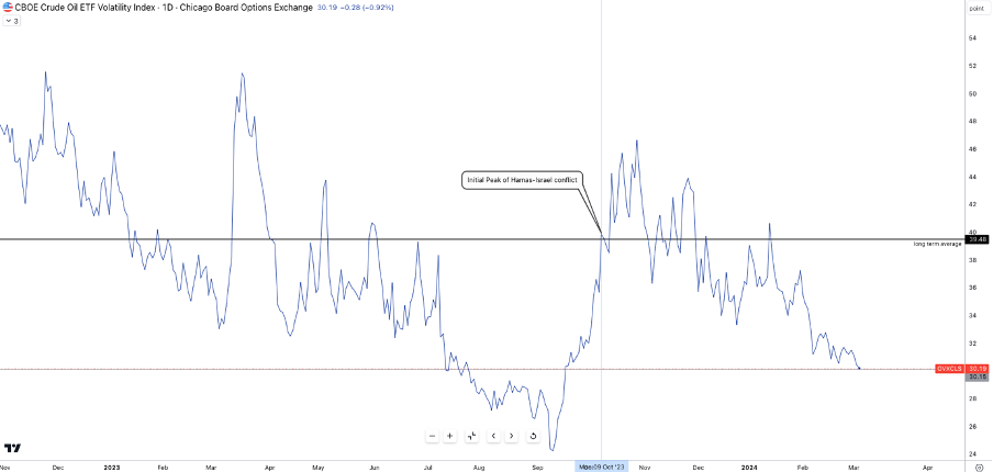 Factoring geopolitics into discretionary positions in 2024 has become somewhat of a norm; whilst tensions in the Middle East persist, the oil markets have settled and had ample time for volatility to subdue. In the peak of the October 7th attack, OVXCLS (Crude Oil Volatility Index) sharply peaked at 40.00 and continued its rise peaking on the 27th of October at 46.5, right after the Israel Defence Forces announced that it is “expanding ground operations” in the Gaza Strip and “operating forcefully” on all fronts against the militant group.