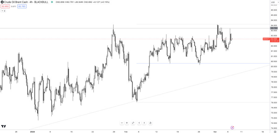 As it stands Brent crude oil futures are in backwardation, meaning that Brent spot prices are trading higher than the Brent futures price. This means that the market expects the price of Brent crude to decrease further along the curve (later date in the future). In a normal market, the Brent futures curve is in contango, meaning that the forward price of Brent is higher than. the spot price, reflecting the market’s expectation of higher prices. Doubts regarding China's ability to hit its 5% growth target for 2024 raise concerns about weakening oil demand. As the world's largest oil consumer, a lack of significant stimulus could significantly dampen Chinese demand throughout the year, putting downward pressure on oil prices.