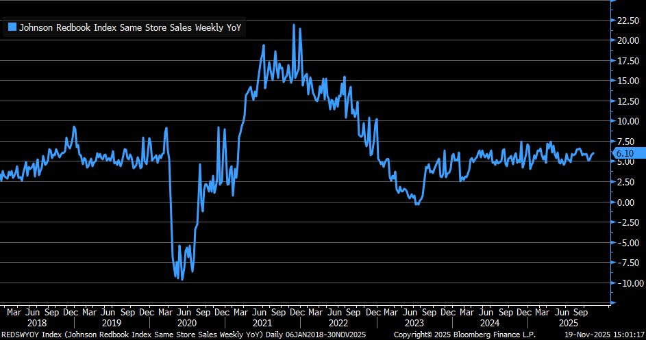 The consumer is fine. Johnson Redbook retail sales haven’t exploded, but in a high-rate world with four years of elevated inflation, that’s normal. The important bit is that the chart is still climbing. People are spending.