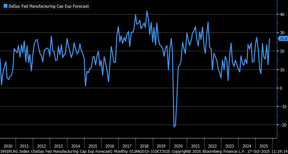 The six month outlook for capex rose in October to its highest level since January. Manufacturing capex is still pushing strong. Services capex is softening a bit, but copper doesn’t really care about that. It cares about the hard-asset, industrial side.