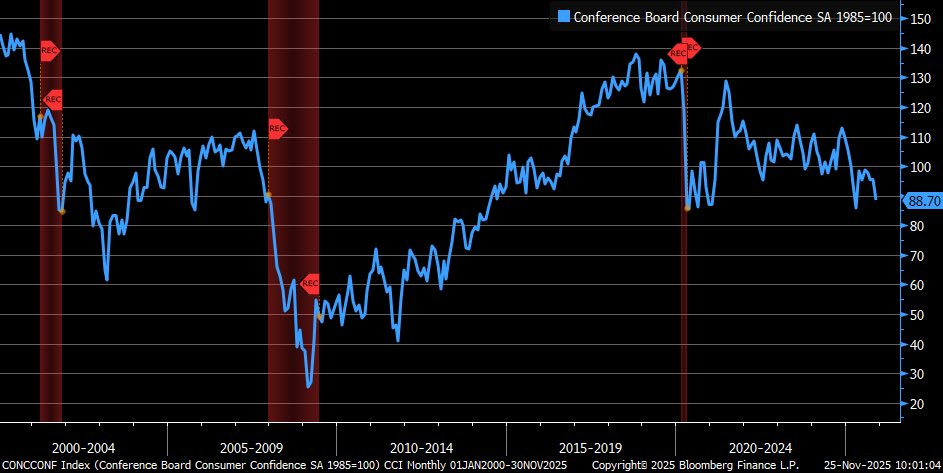 Some will point to declining consumer confidence. But confidence only genuinely matters when it spills over into reduced spending, and that isn’t happening. Context matters. Consumers were staring down multiple tail risks as Trump took office, tariffs being the big one. Yes, confidence dipped, but spending didn’t. We’re still sitting in historically normal territory.