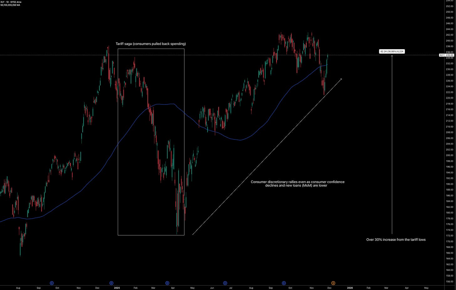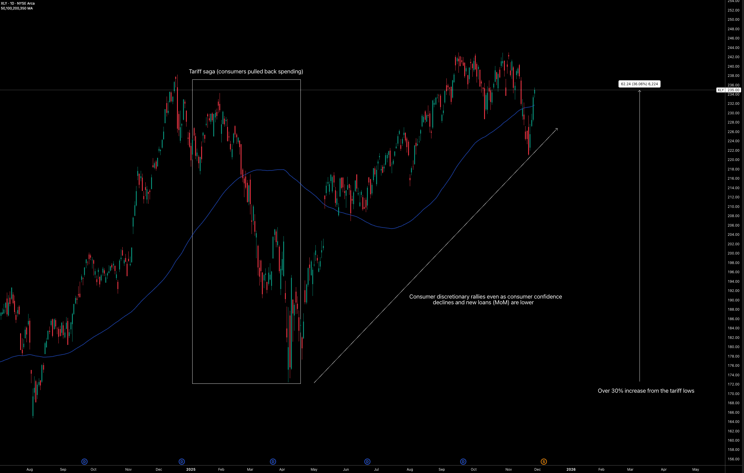 If retail sales aren’t your favourite indicator, you can just look at the market. Consumer discretionary is usually the first sector to take a hit when households are in trouble. Instead, it’s doing the exact opposite, which tells you everything.