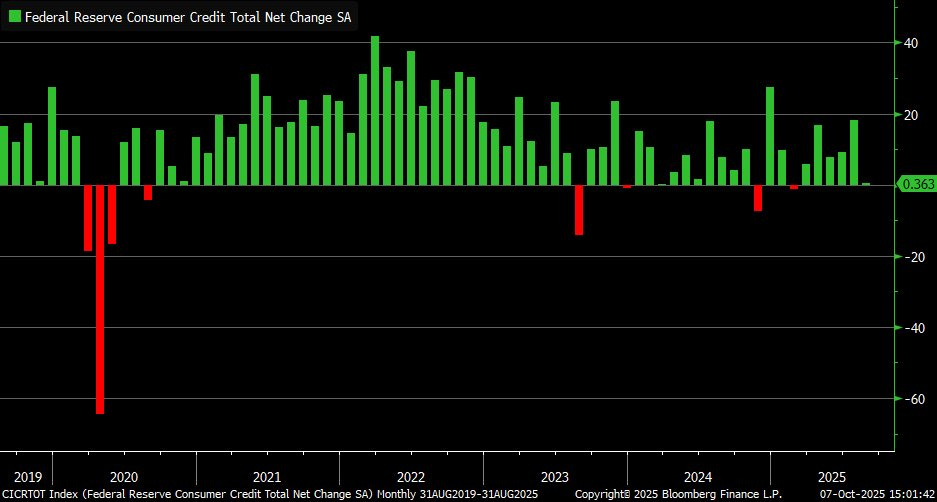 Then there’s the “consumer credit is low” argument. Again, context. People loaded up on credit during 2020 to 2022. After massive credit intake, of course MoM credit growth slows, especially with tariff uncertainty in the background. And focusing on one month is meaningless. 2025 as a whole has seen a solid increase in credit. And again, spending continues.
