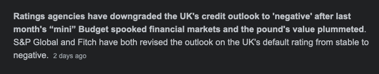 Tying this back to more recent events you can see why the Uk is under soo much stress as the credit market faced this hit. Explains the massive amount of selling in gilt markets and the pound as Uk’s debt market was recently downgraded to AA-. A rating that is still high grade but screams to investors “greater risk, I’m going to need a bigger risk premia” - hence why yields are up on every gilt and also why the Bank of England have had to set in to salvage the bond market from tearing apart.