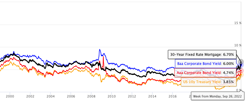 Credit spreads are obviously affected by the degree of borrower’s creditworthiness, but as you can see the regulatory and institutional constraints affecting the decision making progress of huge fixed income buyers play an important role too. So higher rates cause trouble within the private sector when it comes to credit worthiness.