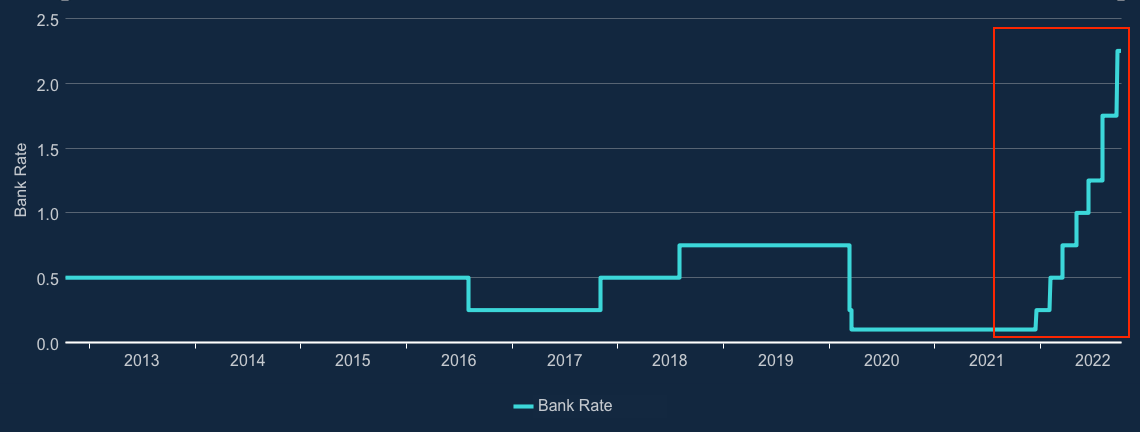 Before we look at the trouble rates are causing within the housing market this chart shows the Bank of England’s official base rate. As aforementioned, rates within the Uk have hovered around 0.5% for the most part of a decade, if not more.