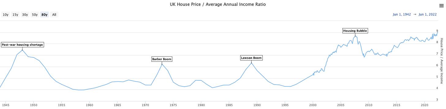 Figure 4 puts in perspective how elevated home prices are relative to the median income within the Uk. Historically, the Uk house price/ average annual income ratio within the Uk has floated between 4 and 5; except for the Barber Boom and Lawson Boom. Just for some context the Barber boom was named after Uk’s Chancellor Anthony Barber back in the 1970’s, whose budget, designed to return the Conservatives to power, led to a brief period of growth known as “The Barber Boom” that unfortunately pushed the economy into a recession. With inflation in the double figures rates had to be increased having a detrimentally negative affect on housing affordability. Some analysts think we’re returning to the 1970’s inflationary period, as we already breached double digits early this year topping 10.1% to be exact.