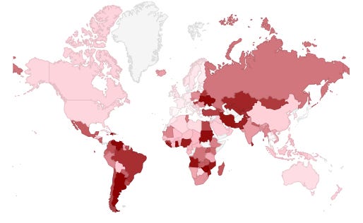 The below figure shows the a quick-view of how the rest of the world is battling this period of stagflation; a period where inflation is accompanied by low or non existent economic growth. As you guessed, the darker the red/shading, the higher the country’s interest rate.