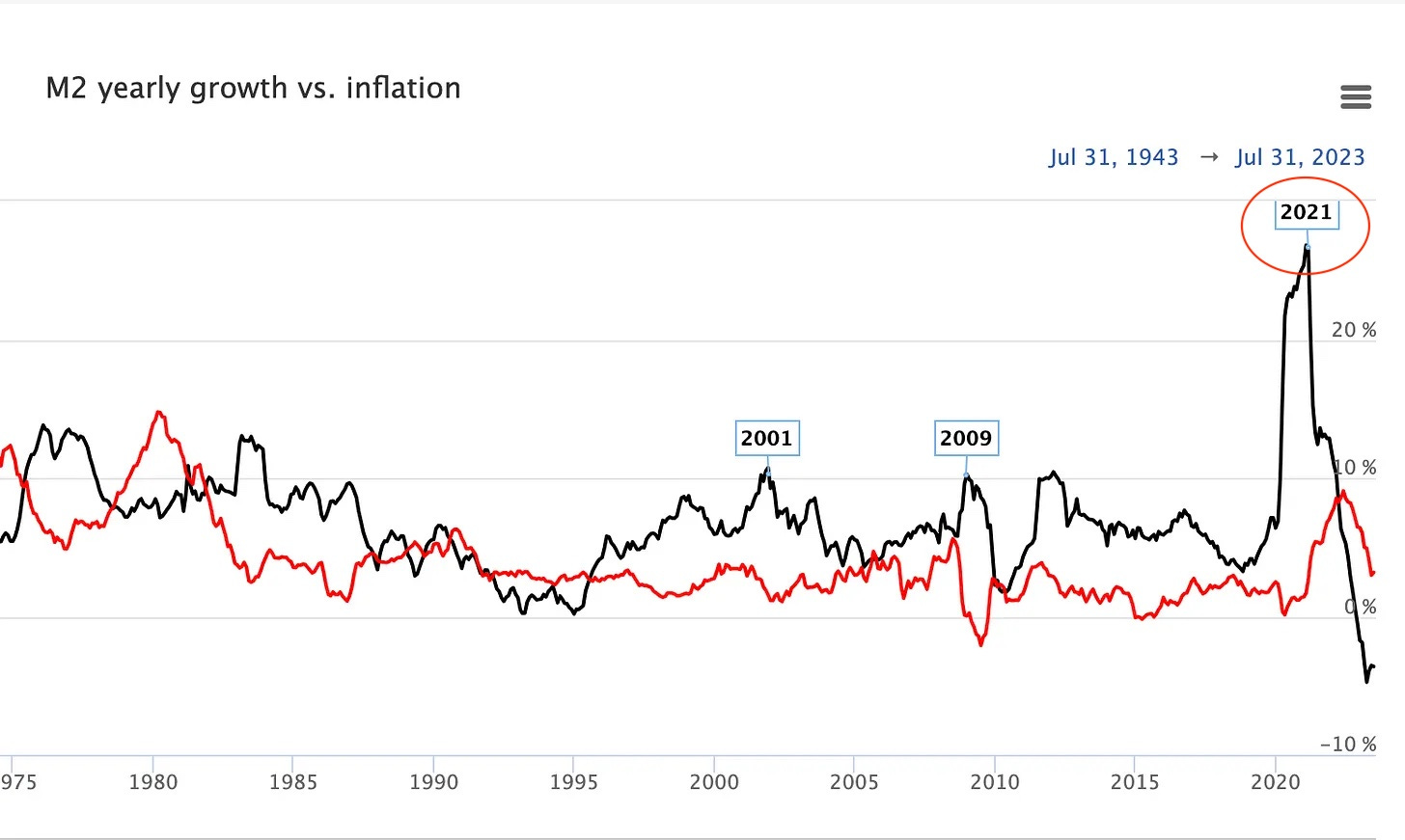 The black line represents inflation M2 (money supply) YoY growth the red is inflation. During 2021, the M2 growth was 26%! For those who access ‘The Macro Guide For Traders’ I explain why that number is so significant. Now remember, interest rates were still at 0.00% in response to the Covid crash.