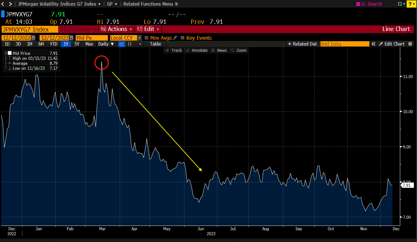 In 2023, G7 FX experienced subdued volatility for the most part, with the notable exception of the banking crisis in March, which triggered a sharp spike in volatility across all asset markets. Before delving into the factors underpinning 2023's muted volatility, it’s crucial to understand the key drivers of forex market volatility.