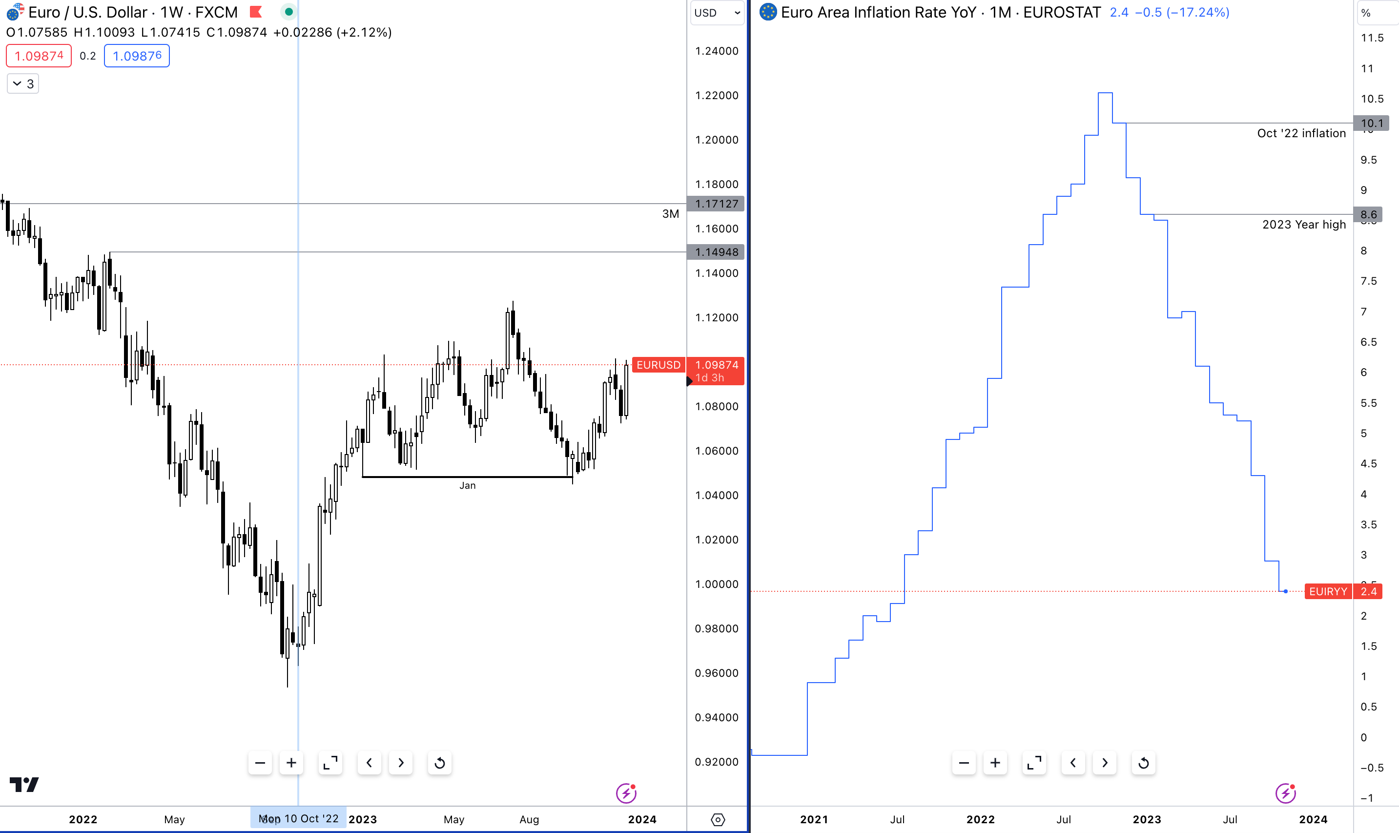 My outlook for the Euro is divided between my assessment of the Euro Area economy and my analysis of the currency's performance. The Euro Area has exhibited noteworthy progress throughout 2023, successfully taming inflation from a peak of 8.6% to 2.4% as of November.