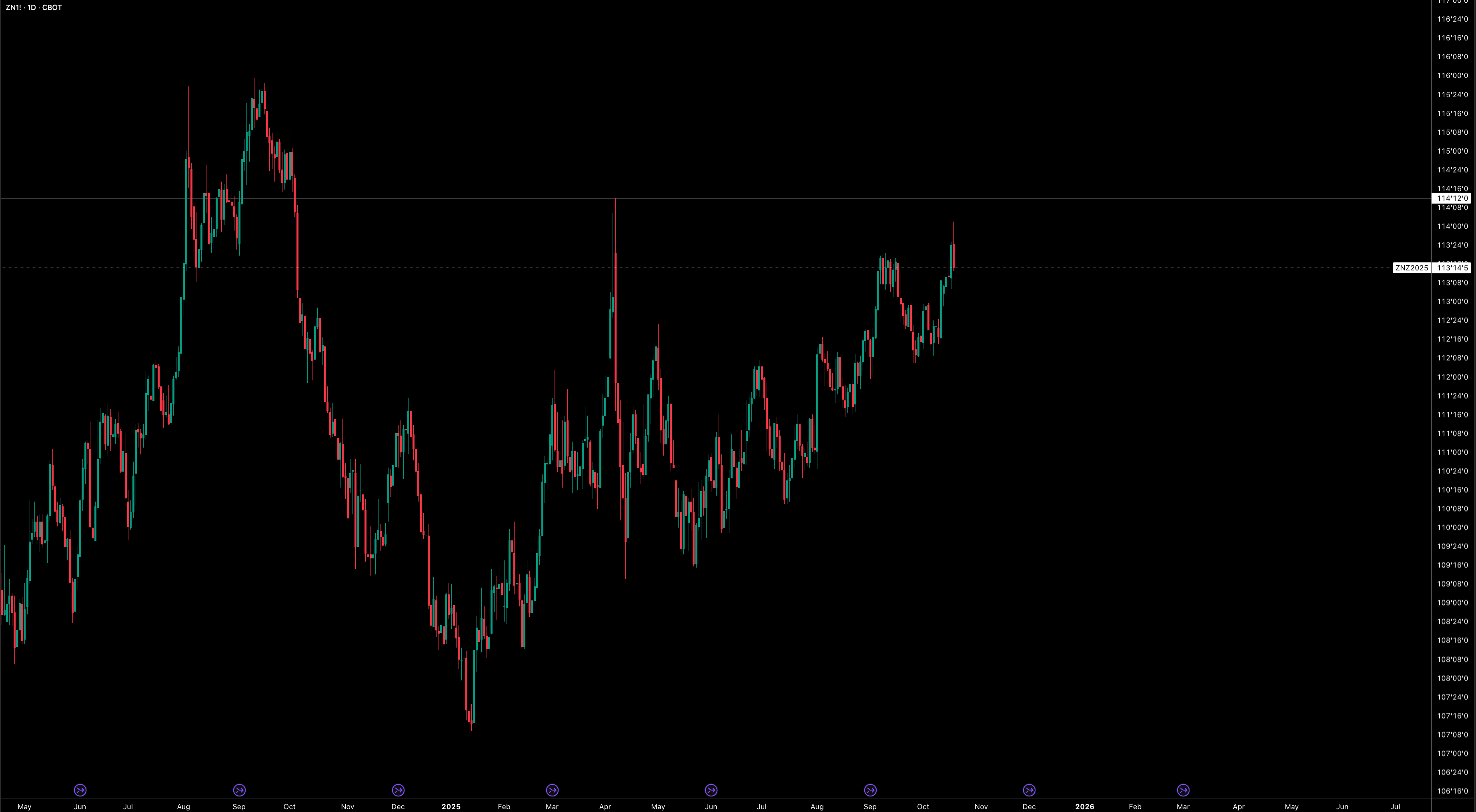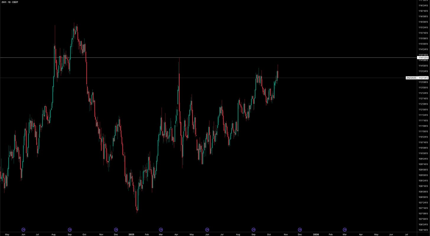 Politically, Caracas is already pushing the U.N. for a ruling labelling the strikes illegal. If that campaign gains traction (or civilian casualties mount) compliance and legal risk increases for traders, shippers, and banks handling Venezuelan-adjacent cargoes. That cools liquidity in the gray areas of the crude market and tightens effective supply even without a formal embargo. As I mentioned above, we’re already see that this rally in bonds is beginning to pressure equities as we fail to make new ATHs. If these tensions escalates and there’s further demand then I’d say that equities would be neutral at best (please don’t put me in the category of bears, yet!). I’d expect the white line in the chart below (114’12) would break with ease on an escalation, but I’d be quick to fade this move as soon as tensions de-escalated because the macro regime we’re in is not supporting tp be this long on bonds. The recent moves are already overblown for an enviroment of strong growth & inflaiton in the face of rate cuts in my take. A prime position would be a shprt on bonds AFTER a de-escalation as lomg as inflation & growth data remains at leats at the levels we’ve been