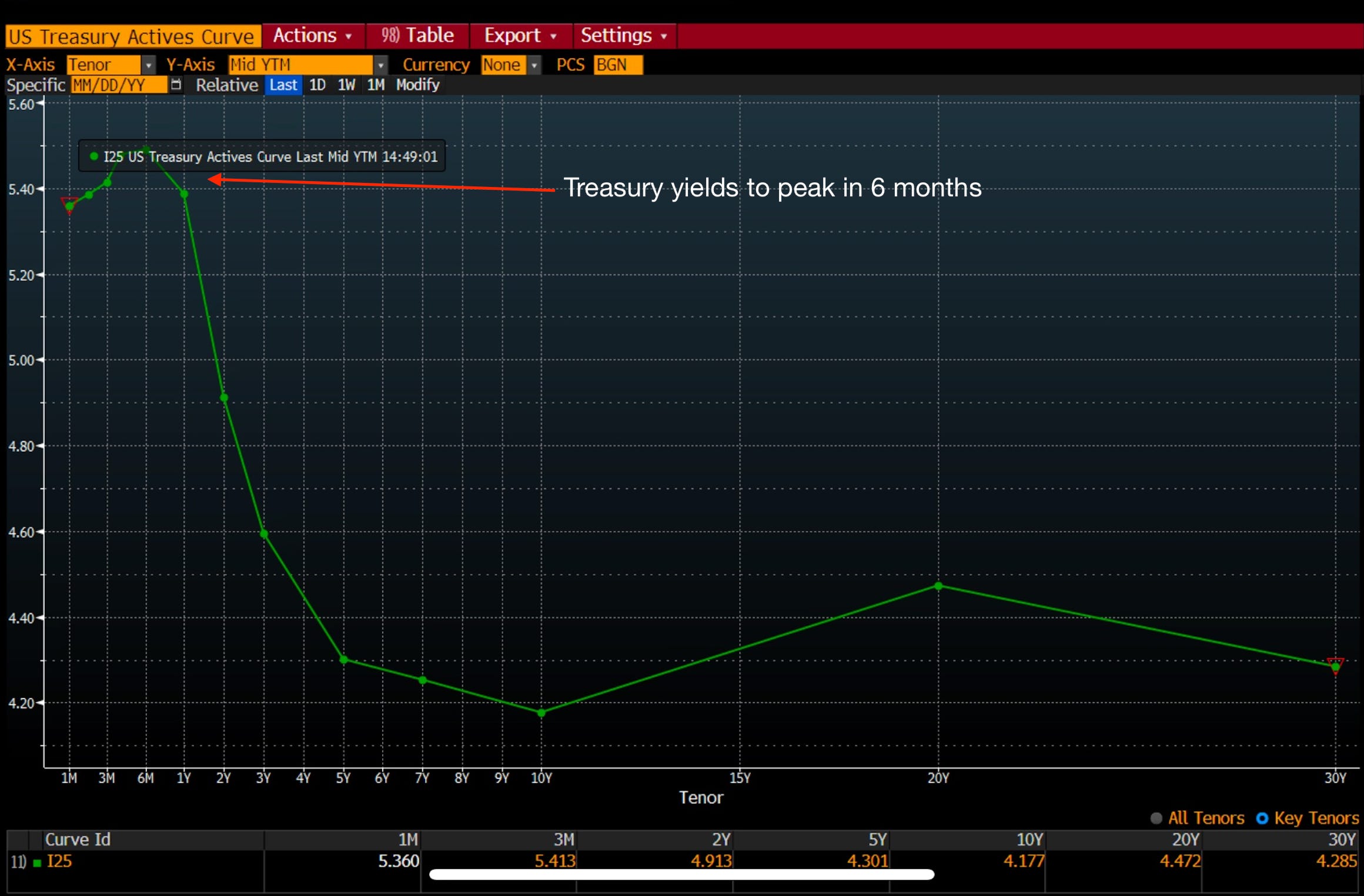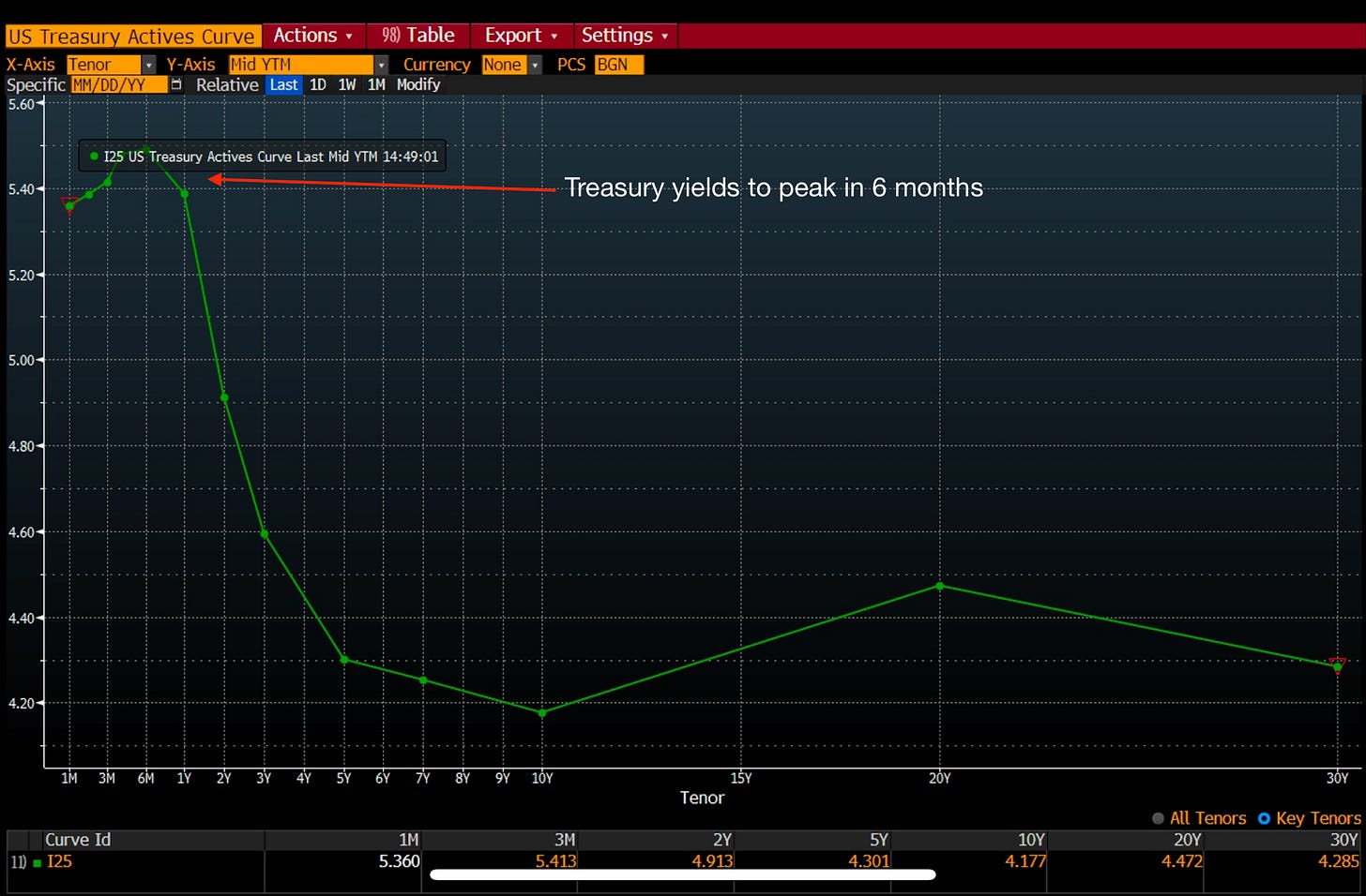 The front end refers to the shorter-dated maturities on the curve, so any bond with a maturity of 4-5 years or less. Looking at the yield curve the front end is elevated due to the hiking cycle, but as we begin to look out towards the medium to long end you can see how drastically rates are expected to decline in response to this hiking cycle.