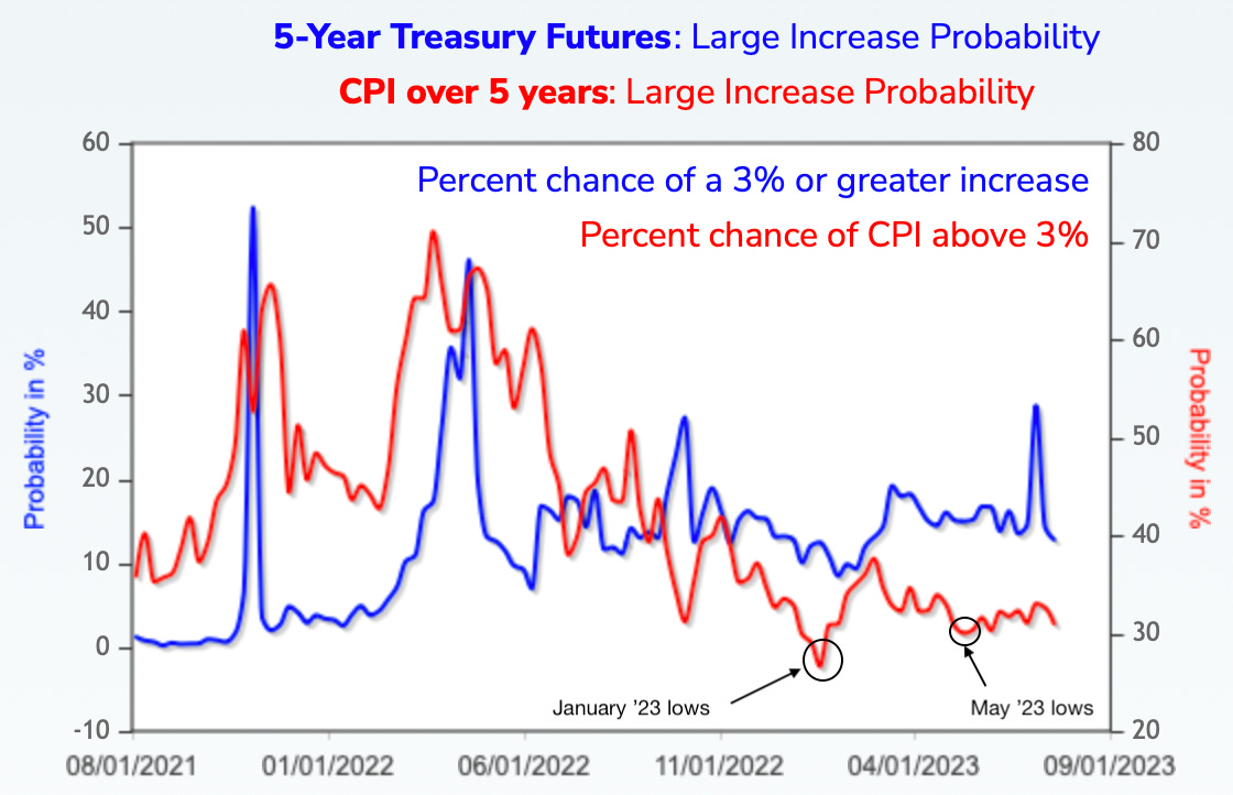 For this purpose, I’d like us to look at the probability of CPI peaking above 3% over the next 5 years and the probability of a large increase in 5-year Treasury Futures.