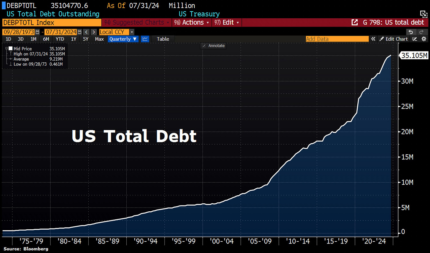 US debt tops $35tn as the federal budget was $1.5tn in the first 10 months of fiscal year 2024. CBO projects a federal budget deficit of $2tn in fiscal year 2024 when adjusted to exclude the efforts of shifts in the timing of certain payments.