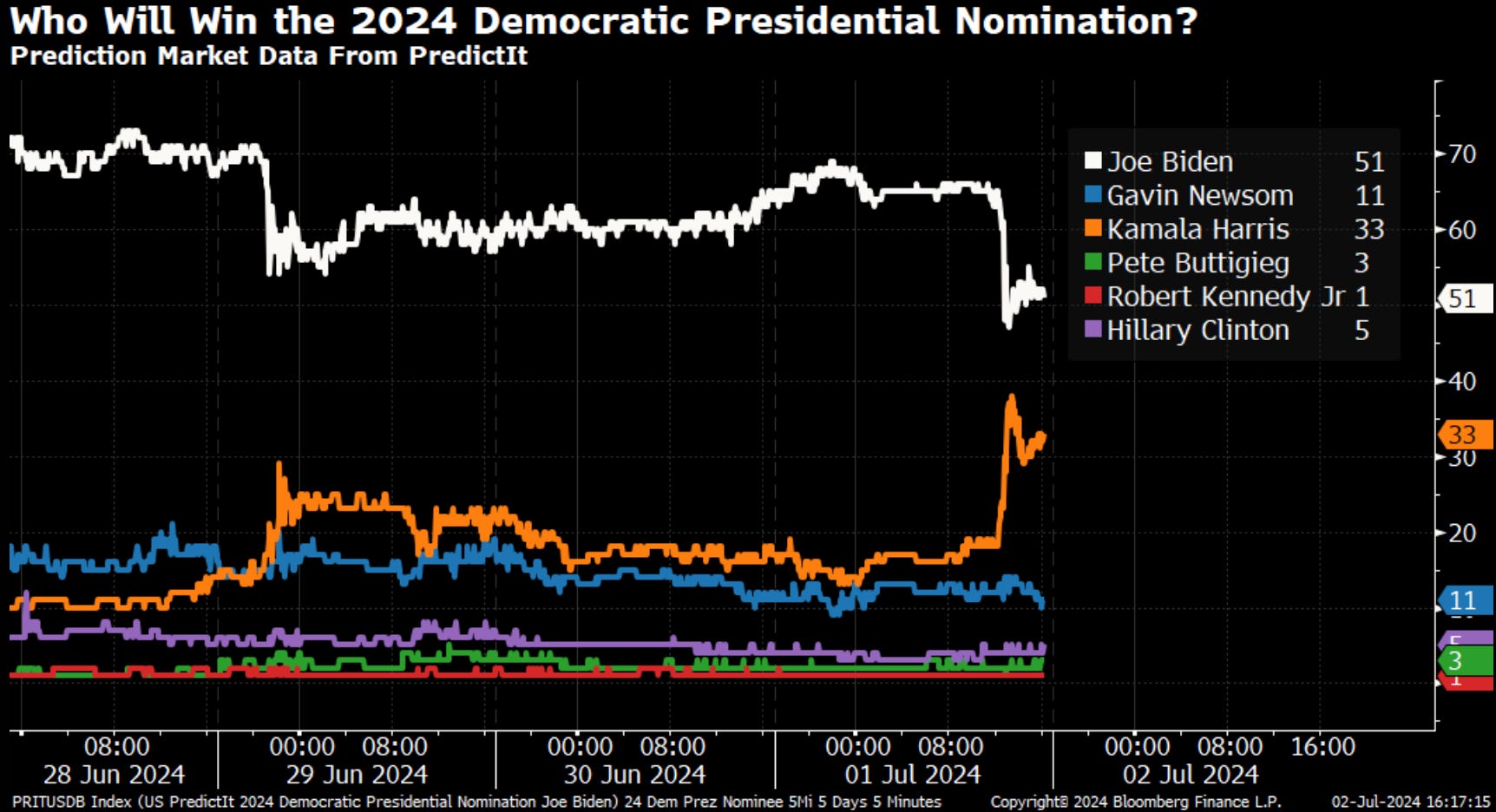 This was the prediction markets earlier this week for who will win the 2024 Democratic Presidential nomination. Leading into July Biden was well ahead of all other nominees, but after an abysmal debate with Trump and rumours of Biden planning to step down from the election race markets have shifted their expectations towards Kamala Harris becoming the frontrunner.
