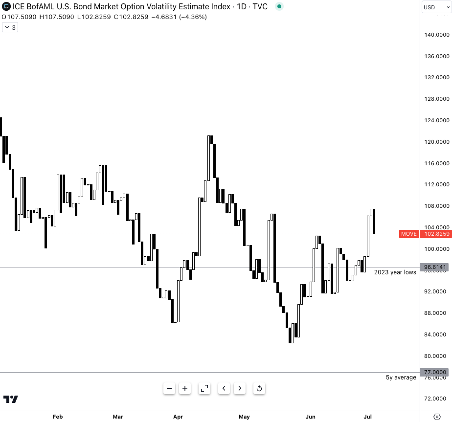 The MOVE index has resurged back towards April levels, and I expect that as we get closer and closer to the November US election period the jitters and chair switching in the Democratic party will cause the MOVE index to remain relatively elevated above the 2023 year low level.