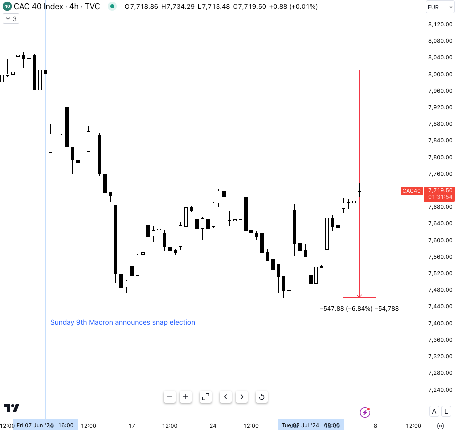 The Labour party here in the UK won the general election by a landslide margin. Keir Starmer is set to become the new PM of the UK, you’ll notice however, zero reaction in currency or equity markets. If anything the pound has caught a bid prior and post the election day/result.