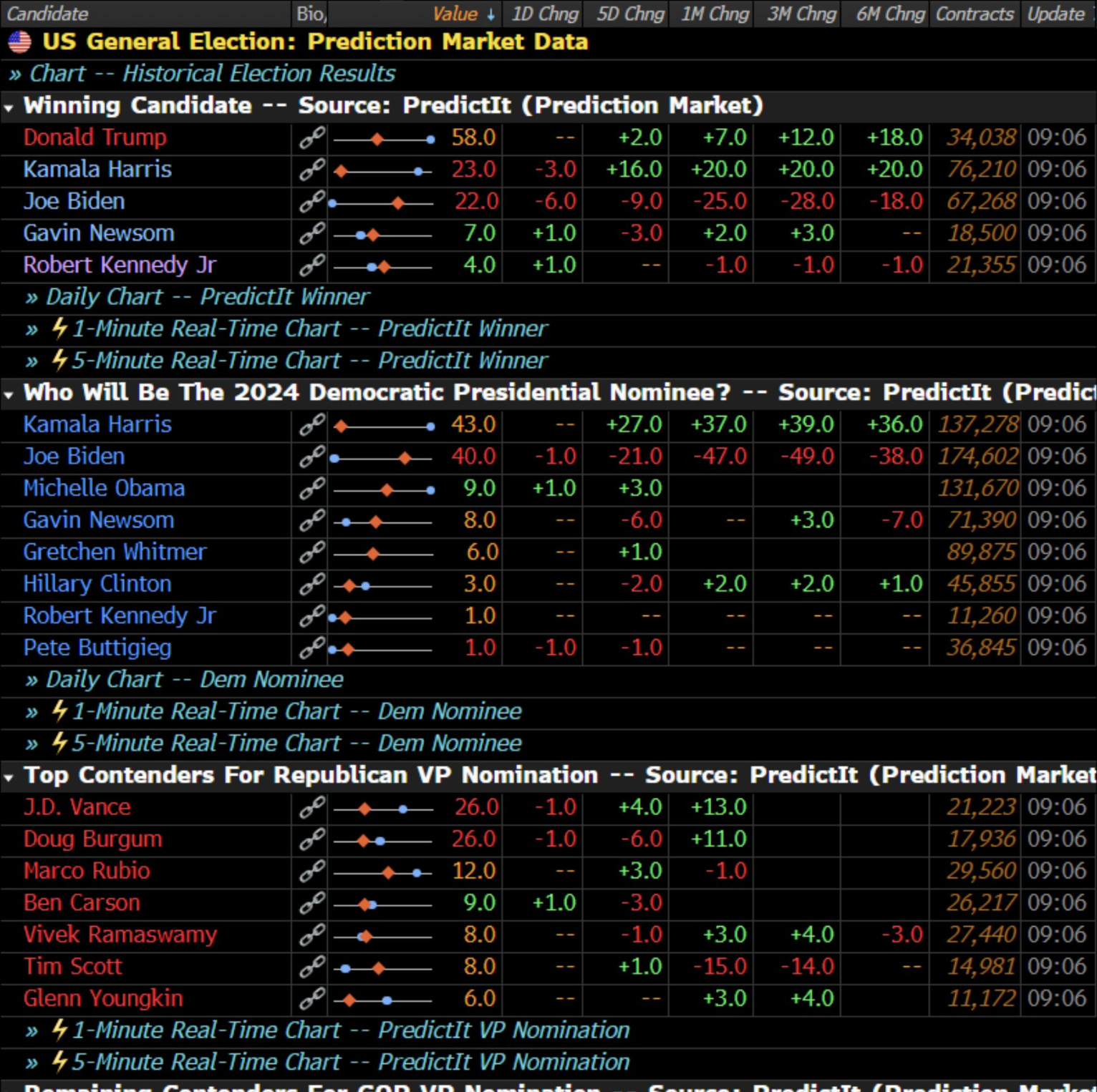Prediction markets like PredictIt, PolyMarket and Kalshi are essentially real-time polls. Through these platforms people are able to bet on the outcome of specific events, such as “will the Fed hike 25bps or cut at the July meeting?” or “will Biden step down as the Dems nominee?”.
