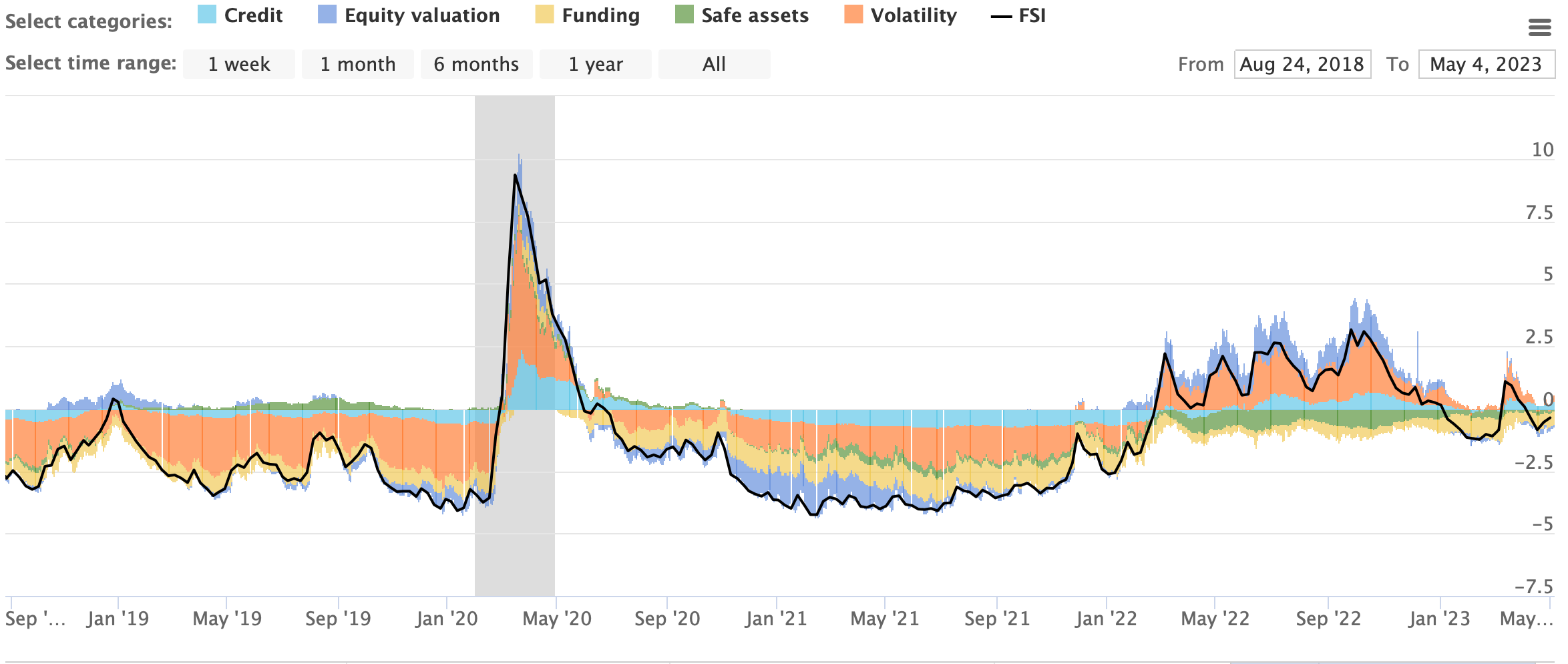 The OFR financial stress index is a daily snapshot of stress within U.S financial markets. Variables like yield spreads, interest rates, credit, and funding all compromise to make this visual chart.